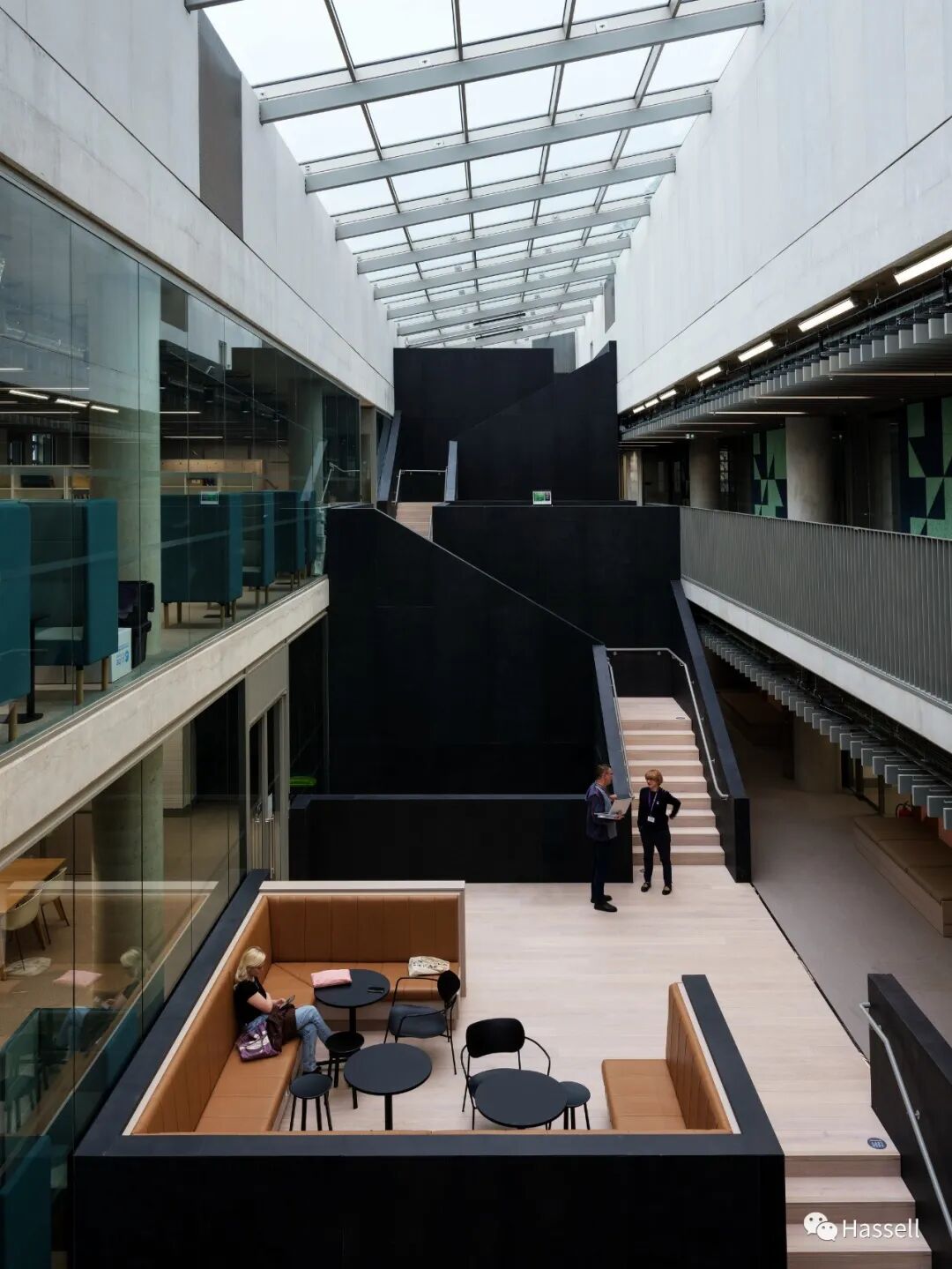 A revitalised ground level connects the business school with the neighbouring campus buildings like the Advanced Engineering Centre, the 800-bed Mithras Student Village, a new pedestrian bridge, the student union, shops, cafes and bars as well as new health and fitness facilities.