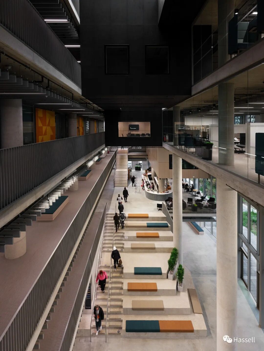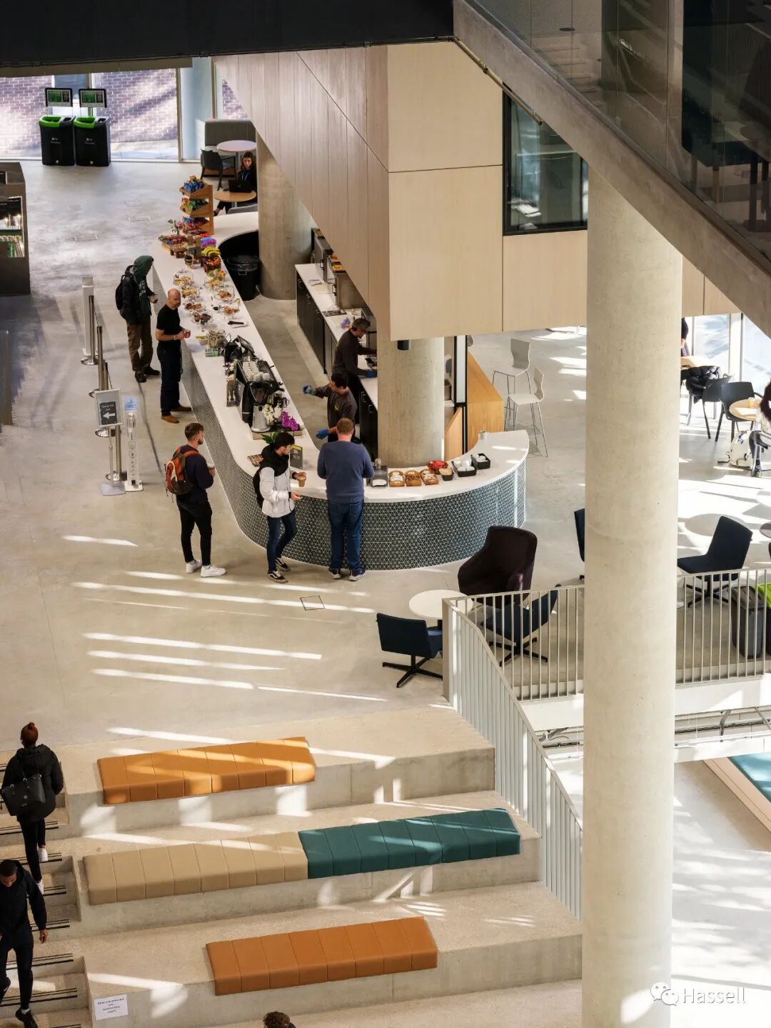 Importantly, the design of the building’s general purpose teaching spaces and student services opens up the business school to other departments and faculties, extending its identity and influence right across the campus.