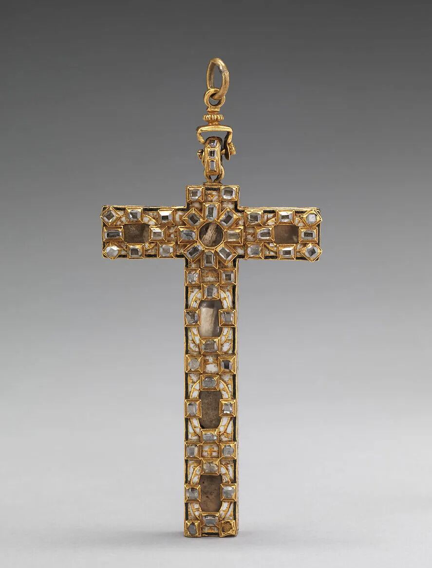 左:17世纪初黄金嵌珐琅及钻石十字架造型祷告链吊坠 / 右:17世纪天使报喜主题黄金嵌珍珠红宝石水晶吊坠 / 大都会博物馆藏