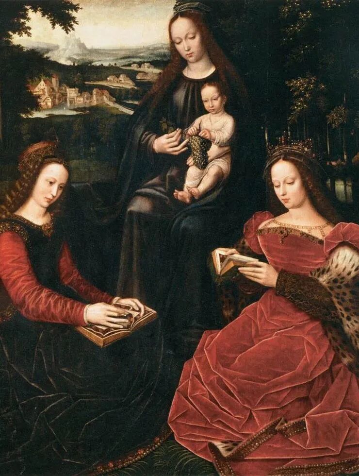 左:纳瓦拉国王查理三世的泥金手抄本时祷书内页,克里夫兰艺术博物馆藏 / 右:《圣母与孩子和圣徒 》,Ambrosius Benson绘