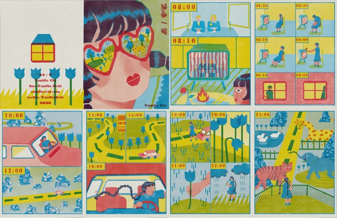 学习插画以来,Vanilla Chi的创作方向可谓五花八门,插画、小体量的漫画、纸上综合媒介、 铜版画、丝网印刷,乃至动画均有涉猎。