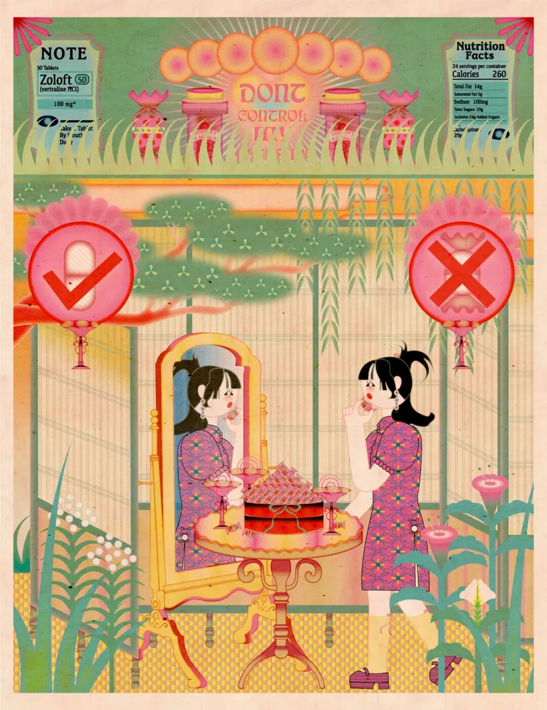 VanillaChi的作品一直天马行空,她的画中充满了东方主义、怀旧、幻想,像是在对童年碎片进行探索。这种巧妙的结合令人过目不忘,且有一种莫名的熟悉感。