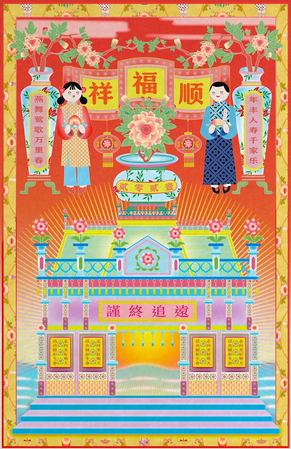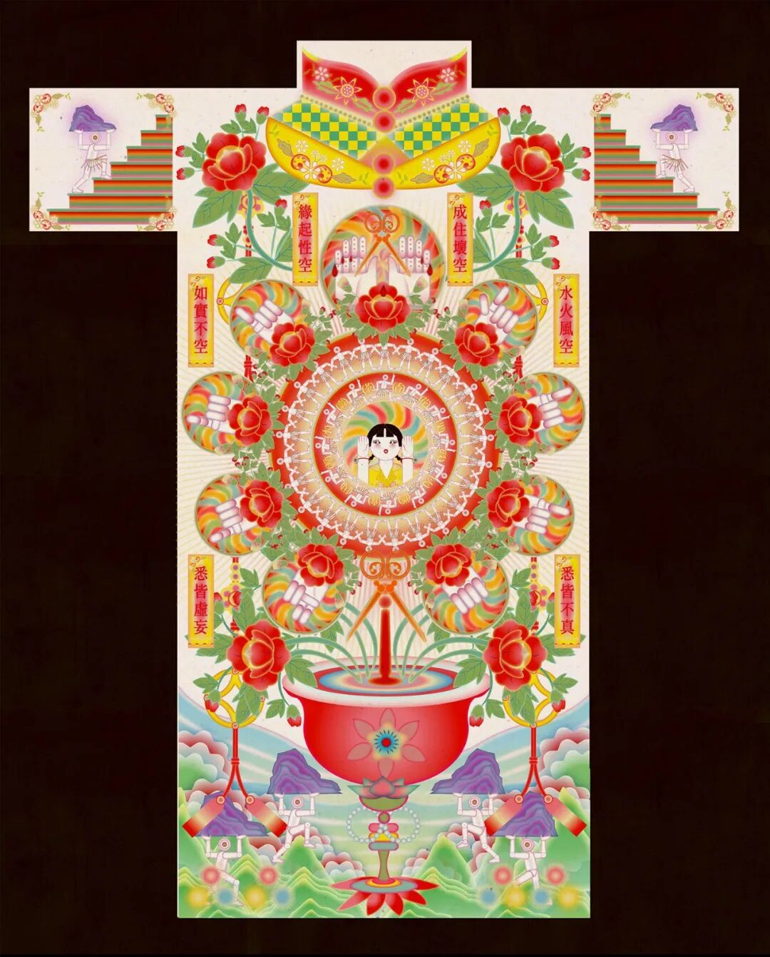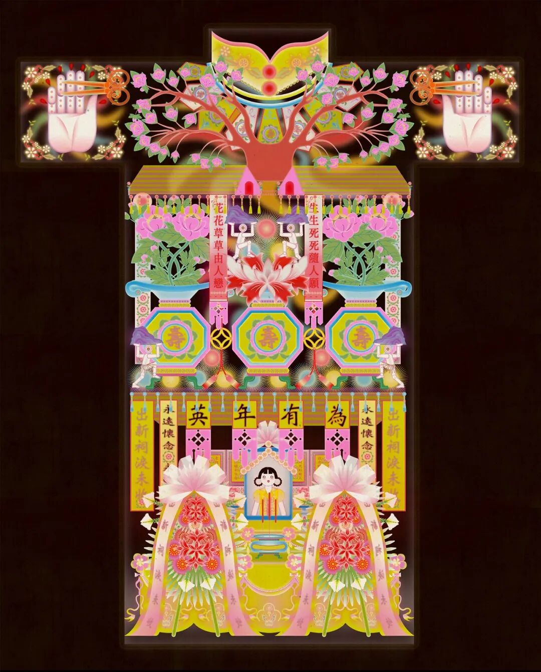 大四时,Vanilla Chi开始研究传统的丧葬与祭祀文化,在作品中描述一些和死亡有关的话题。画中的一部分造型和色彩参考于中国纸扎,“越是研究这部分丧俗文化,就越能意识到其中蕴含的对生命的尊重。”
