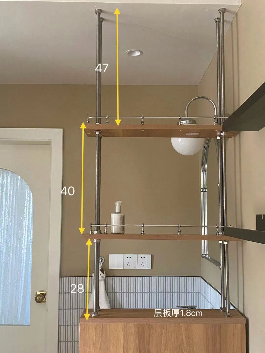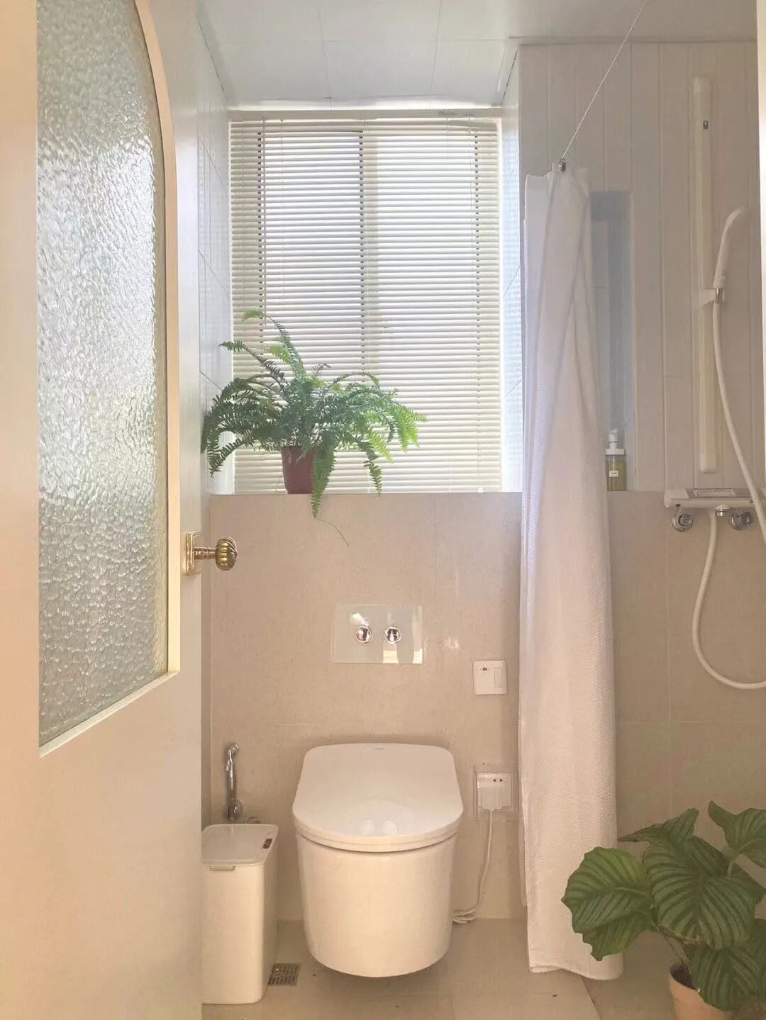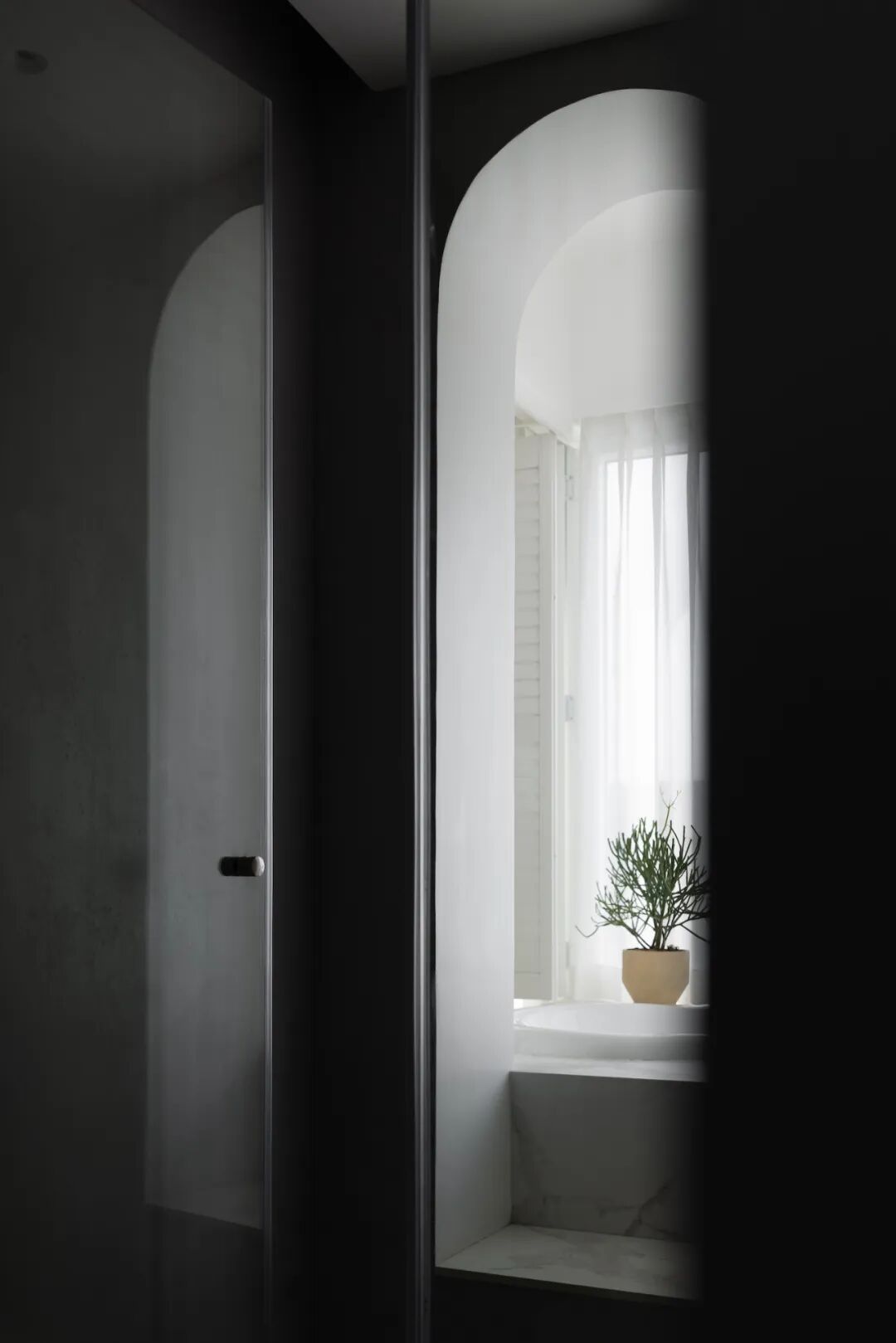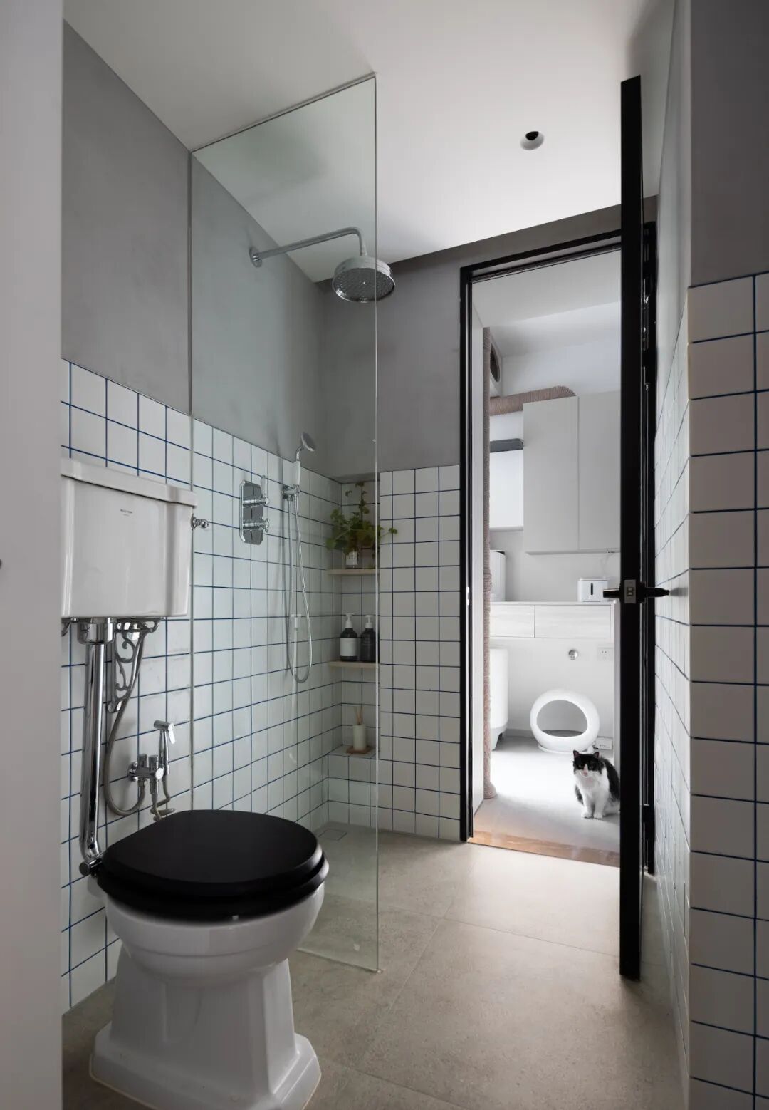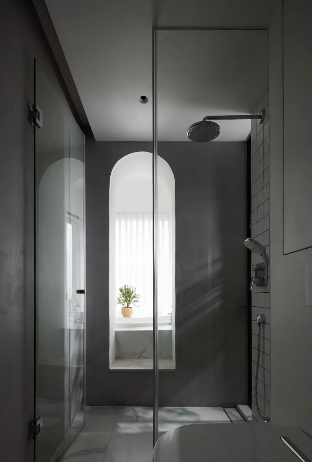 ➡︎ 动线:干区(洗手盆、悬挂式马桶、定制储物柜)⇢淋浴区(花洒)⇢景观浴缸