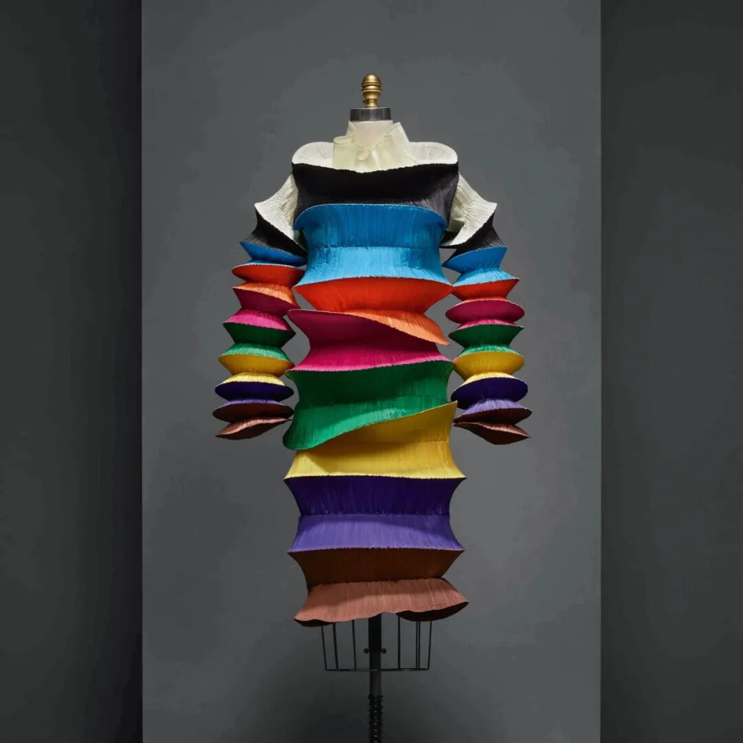 在三宅一生 1994 年春夏时装秀上展示的 Flying Saucer Dress 采用色彩鲜艳的聚酯色调的六角风褶皱圆盘制成。