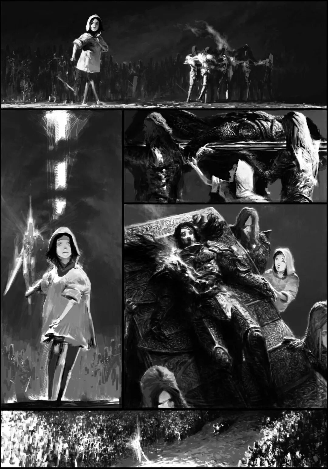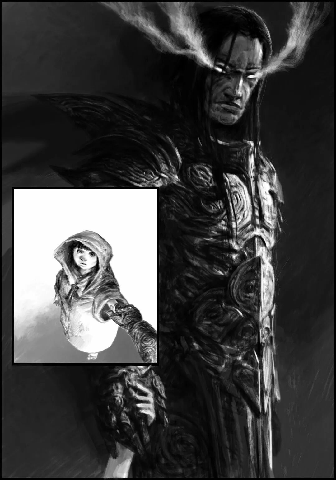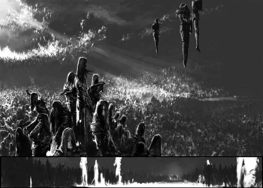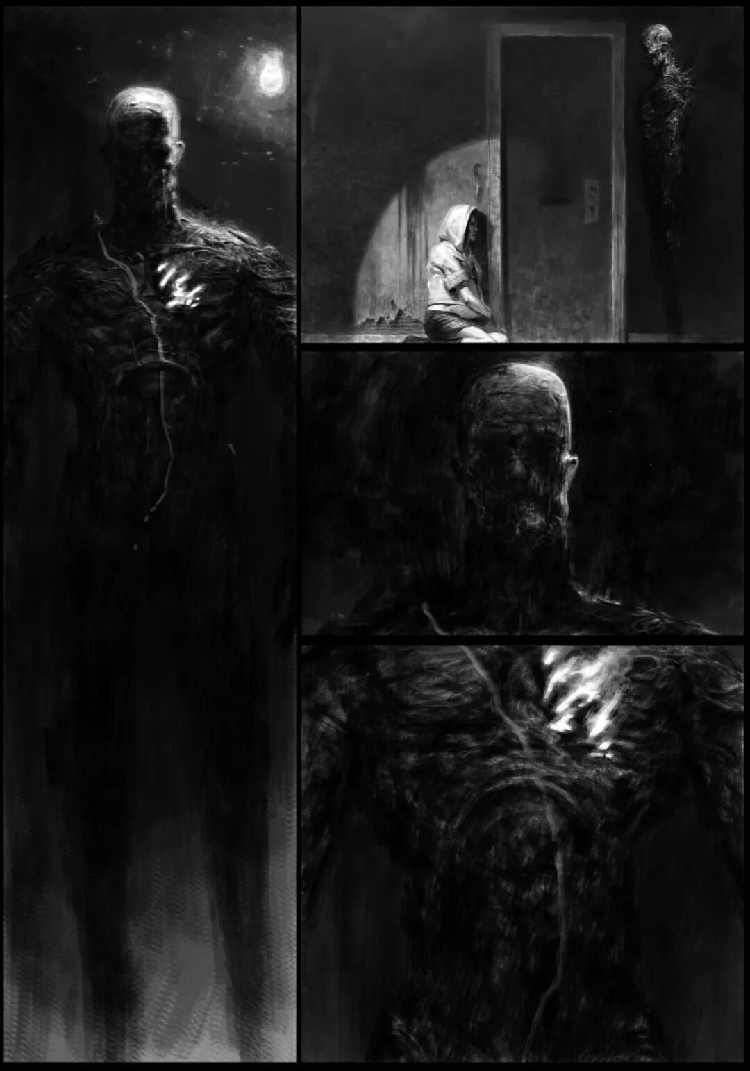 值得一提的是他的黑白稿作品,虽然色彩不复杂,但画面视觉冲击力堪称无懈可击,并且也很注重细节刻画,整体色调和氛围给人不寒而栗的感觉,故事性很强。