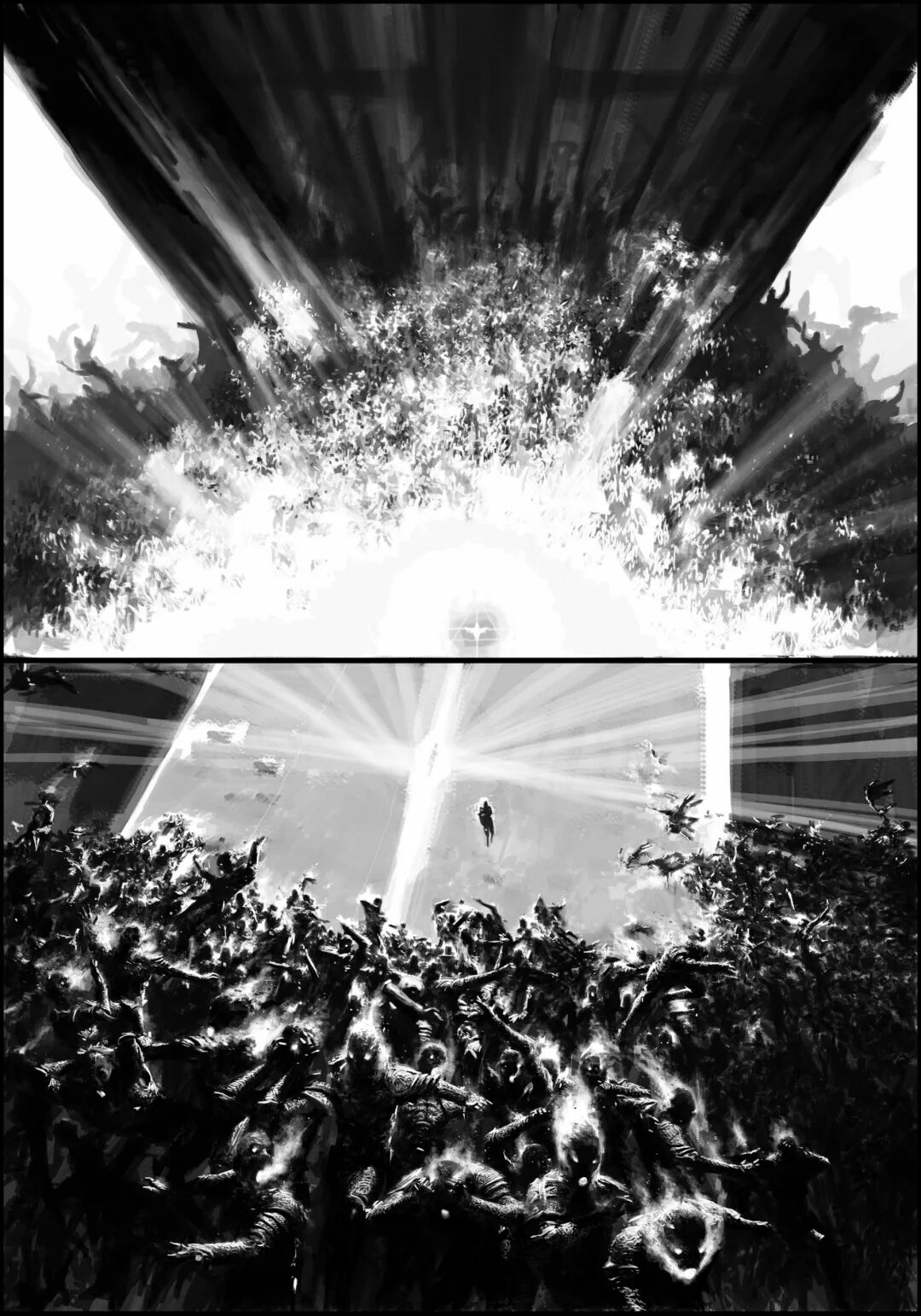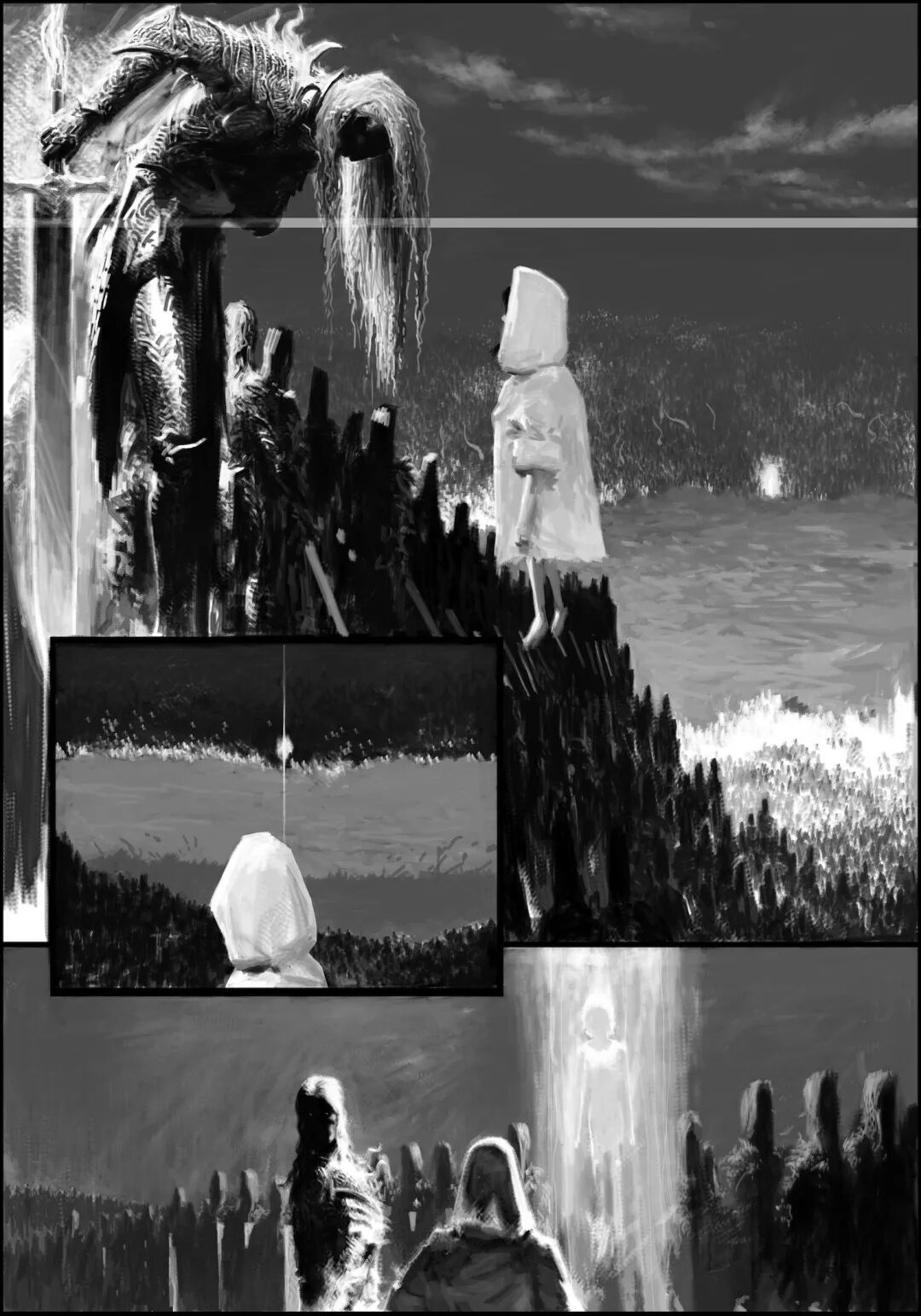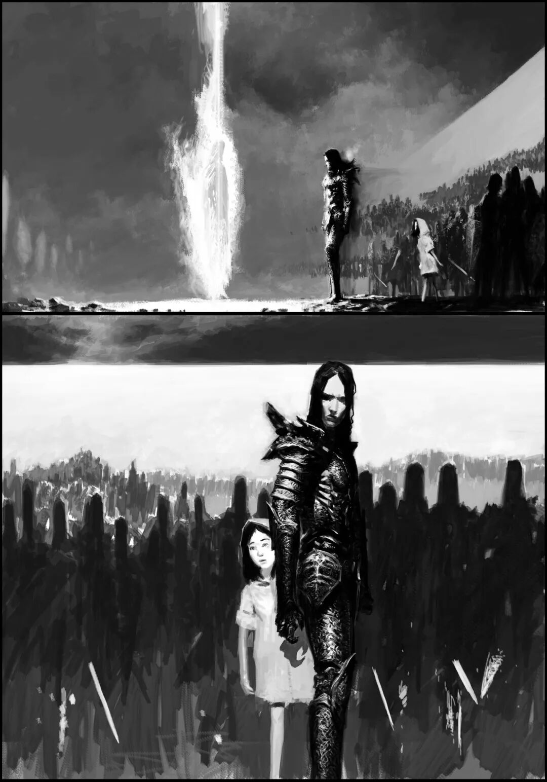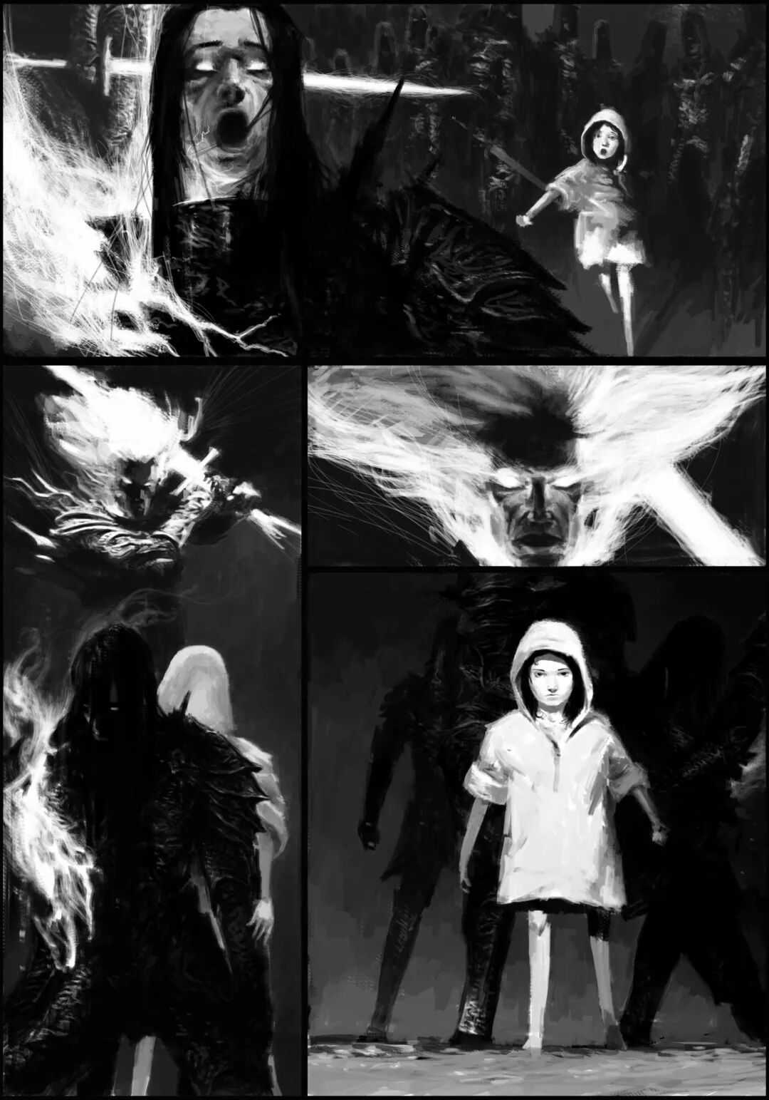 值得一提的是他的黑白稿作品,虽然色彩不复杂,但画面视觉冲击力堪称无懈可击,并且也很注重细节刻画,整体色调和氛围给人不寒而栗的感觉,故事性很强。