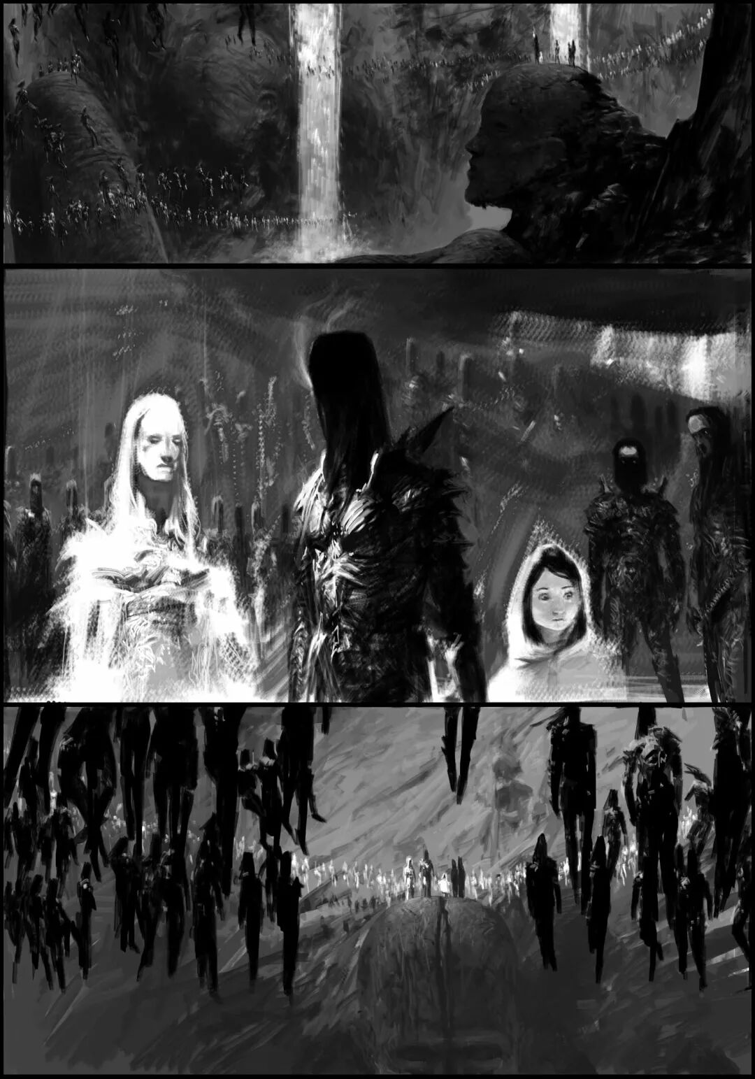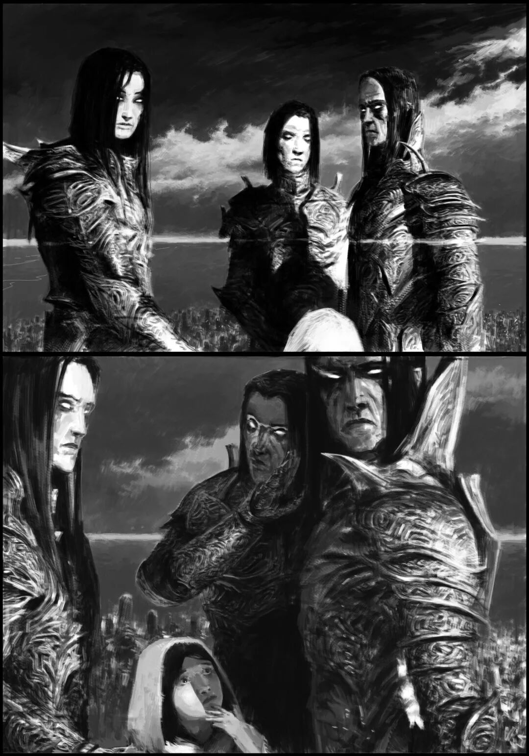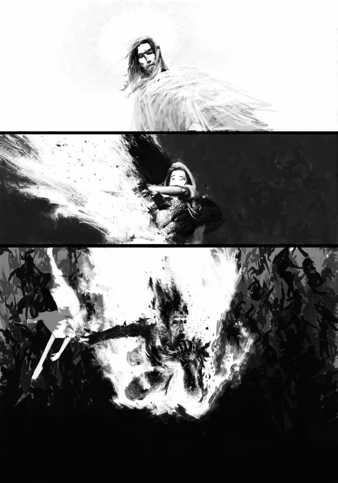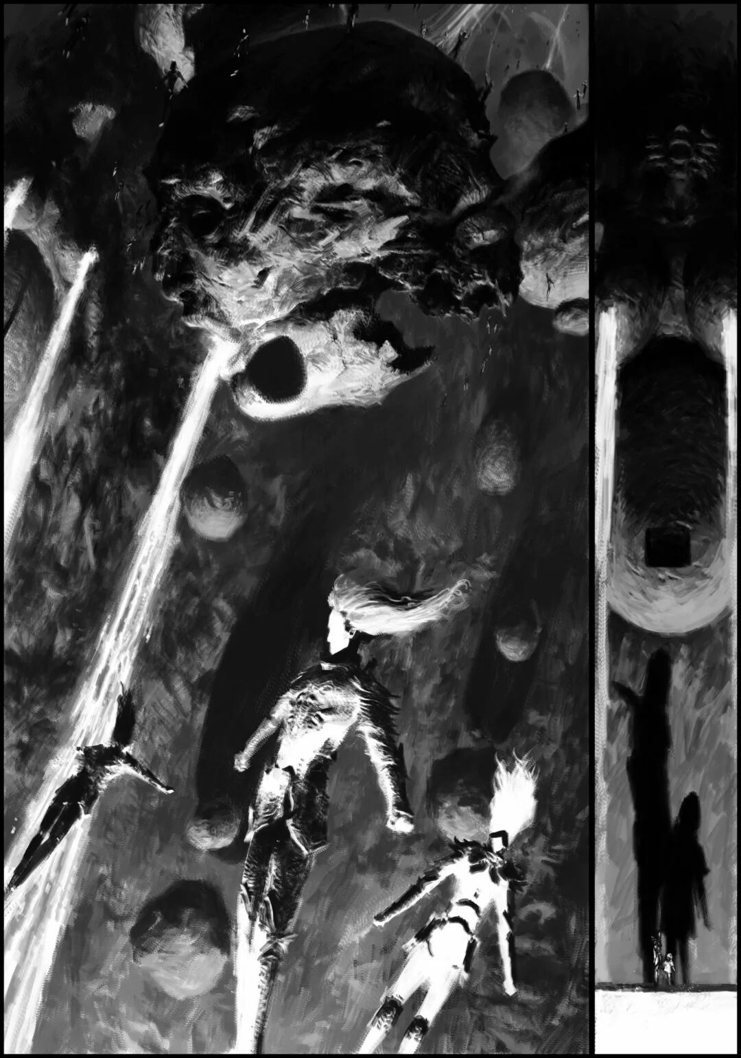 值得一提的是他的黑白稿作品,虽然色彩不复杂,但画面视觉冲击力堪称无懈可击,并且也很注重细节刻画,整体色调和氛围给人不寒而栗的感觉,故事性很强。