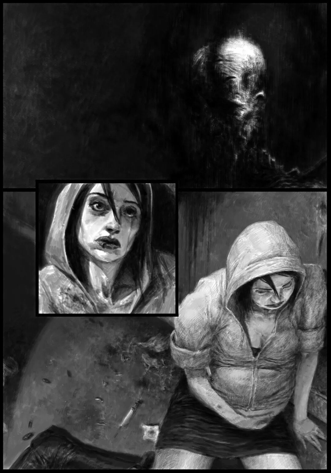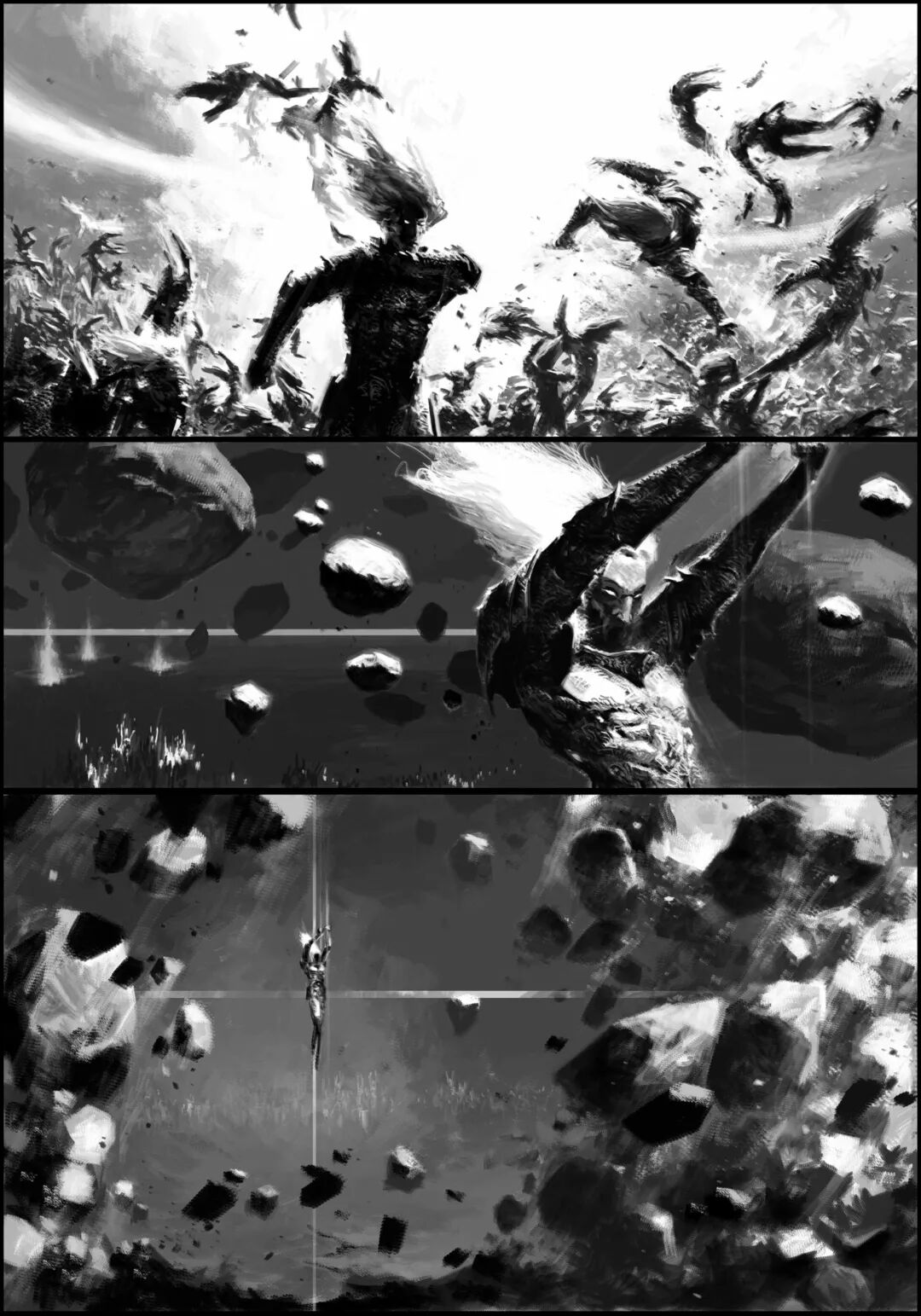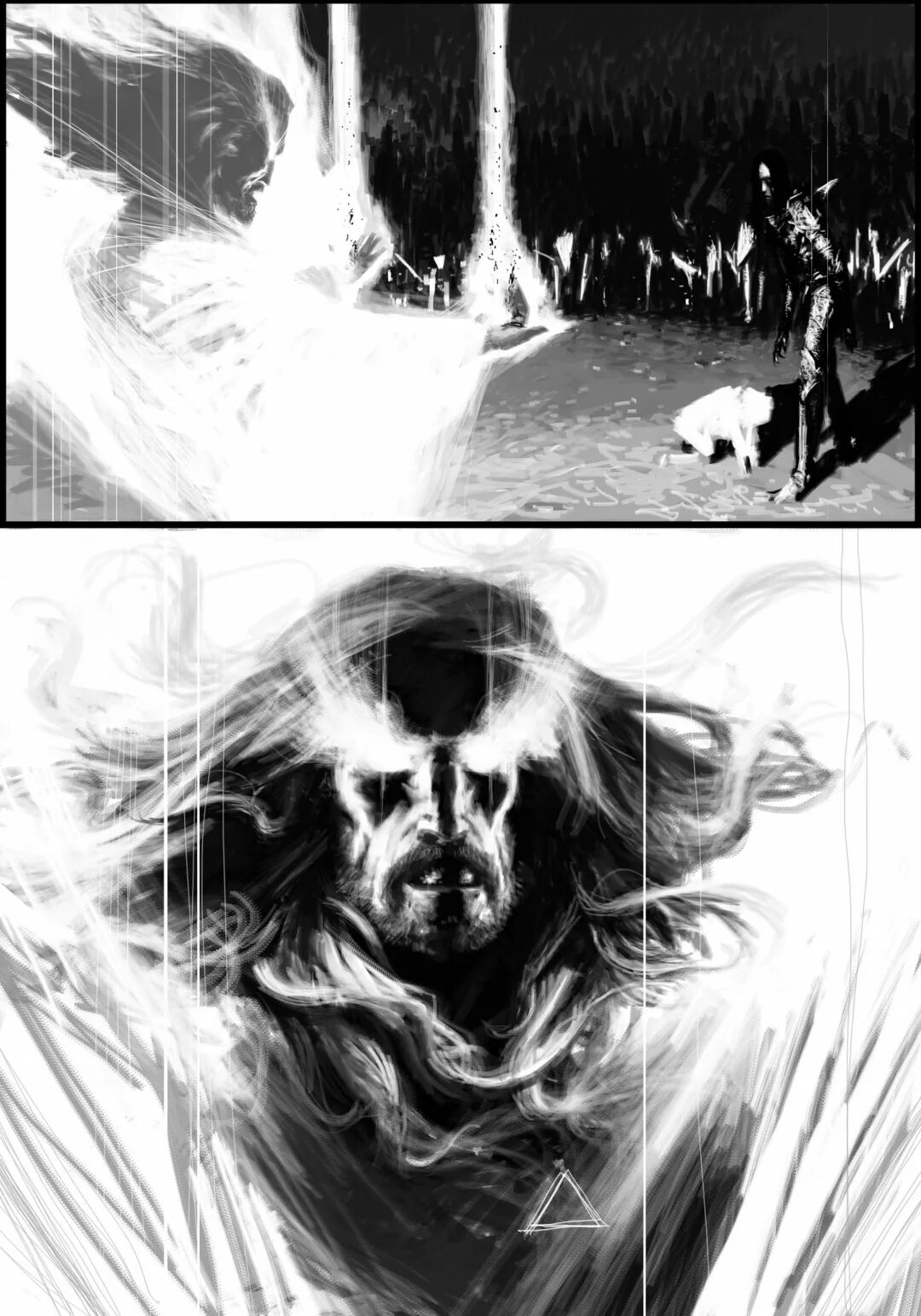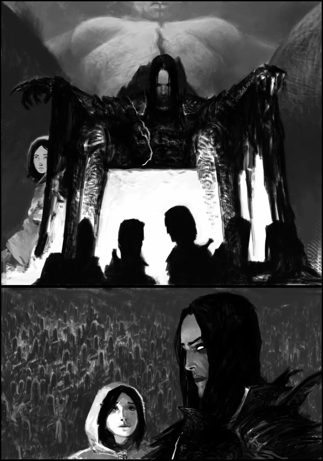 值得一提的是他的黑白稿作品,虽然色彩不复杂,但画面视觉冲击力堪称无懈可击,并且也很注重细节刻画,整体色调和氛围给人不寒而栗的感觉,故事性很强。