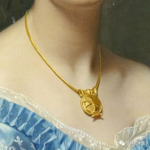画家以熟练的古典精致写实画法,将这位夫人恬淡的性格,十分含蓄而又抒情地表现出来:她神情专注,嘴角微露笑意,圆润的脖颈上配戴着十字花纹的金项链,洁润如玉的双臂,纤柔的手腕上饰有晶莹闪烁的珠宝。