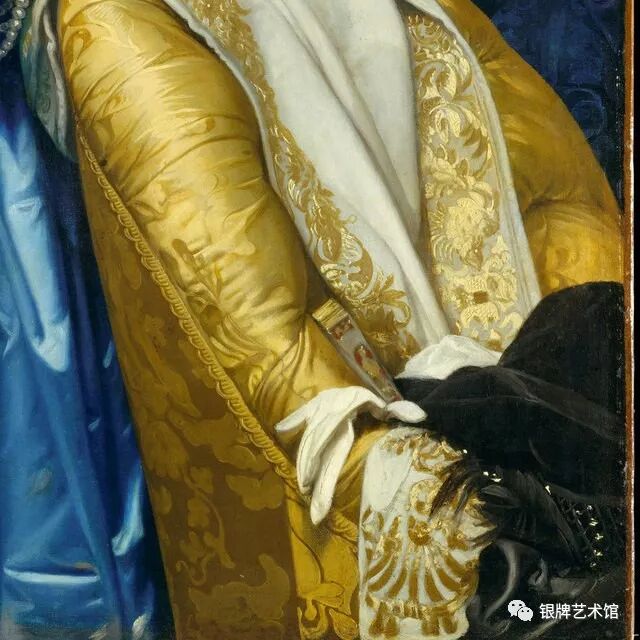 用金色的缎子装饰的椅子也刻画得非常精致,椅子上的一些小物品也都精巧地画了出来,零散地放在椅子上的有手工编织的儿童手套、精美的披肩、有装饰的扇子等等......这一切都被画家细腻极致地描绘了出来,不同织物的质感展现在观众前面,令人惊叹不已,画家是女性美的崇拜者和表现者。