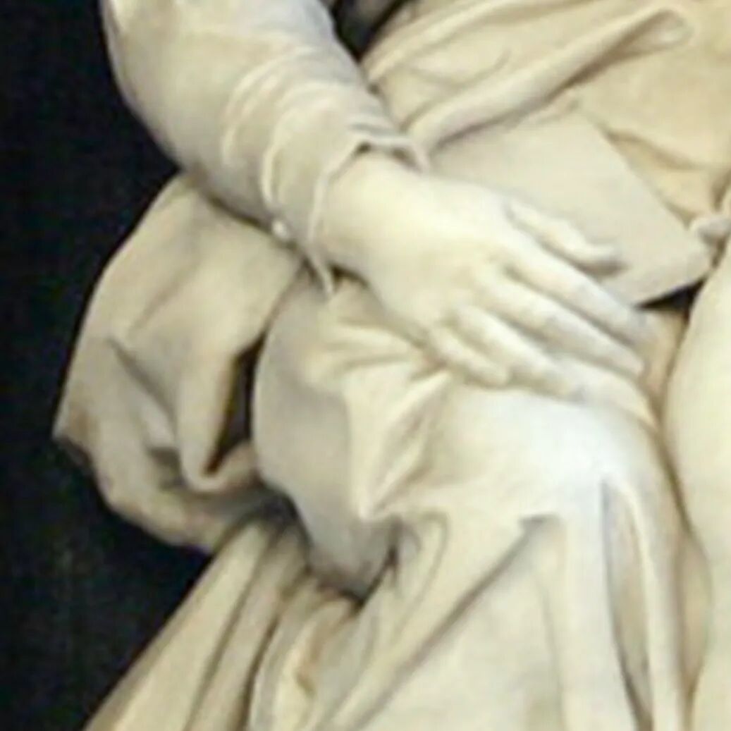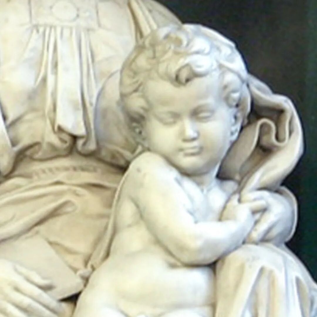 在公元16世纪表现"圣母子"这一主题时,常将小基督处理成一个漂亮、快活的小淘气,而圣母则是衣着华丽、幸福安逸的家庭主妇。但米开朗基罗认为神应该是不同于凡人的,在这里他采用了一种全新的手法。小基督虽也在玩耍,但他很严肃,似乎随时准备离开母亲,去接受他的命运;圣母则面带忧郁,作为一个母亲她似乎已经预感到了基督未来的命运,整个雕像被一种庄严肃穆的气氛笼罩着。