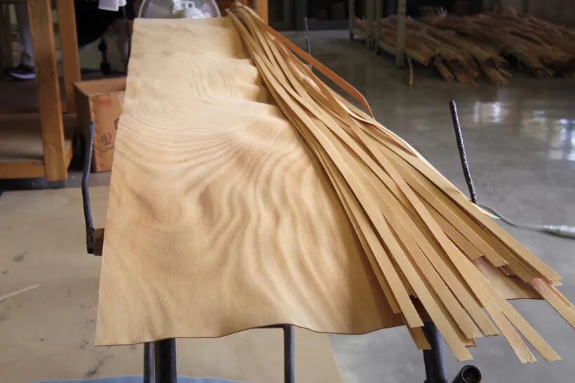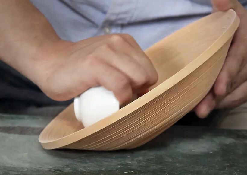 “Bunaco”是为了有效利用日本青森县丰富的山毛榉树而开发的。通过轧制薄而窄的山毛榉木条来创建基于线圈的形状,可以制造出具有较少裂缝和变形的防水物体。