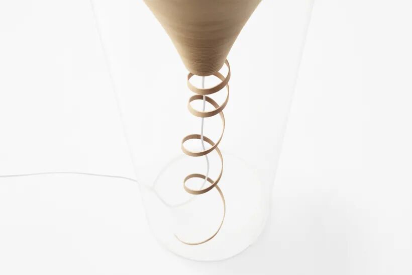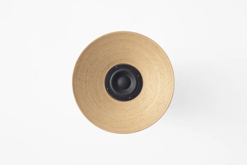 为了突出 Bunaco 木制品的美感,扬声器由透明的亚克力圆柱支撑。清晰的底座可以看到底部卷曲的未完成边缘,使用户能够直观地了解扬声器的结构以及在其生产中投入的工艺。