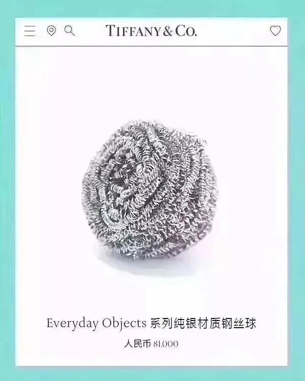 Tiffany在“EverydayObjects”系列中,出过售价81000元的刷锅钢丝球,每根纤维都由纯银制作。一般人应该不会去用8万元的东西来洗锅,而且放在那里好像也感受不到作为艺术品的美感......