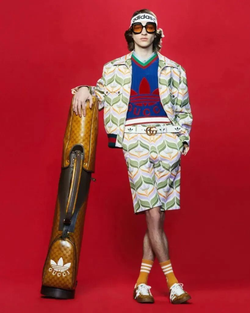 今年2月,Gucci在米兰时装周举办了2022秋冬大秀,秀场上顺势官宣了与阿迪达斯的联名。这个系列依旧是Gucci拿手的70年代复古华丽风格,融入了阿迪达斯“三道杠”元素,出现专属的联名款印花,在华丽中增添了许多运动趣味。