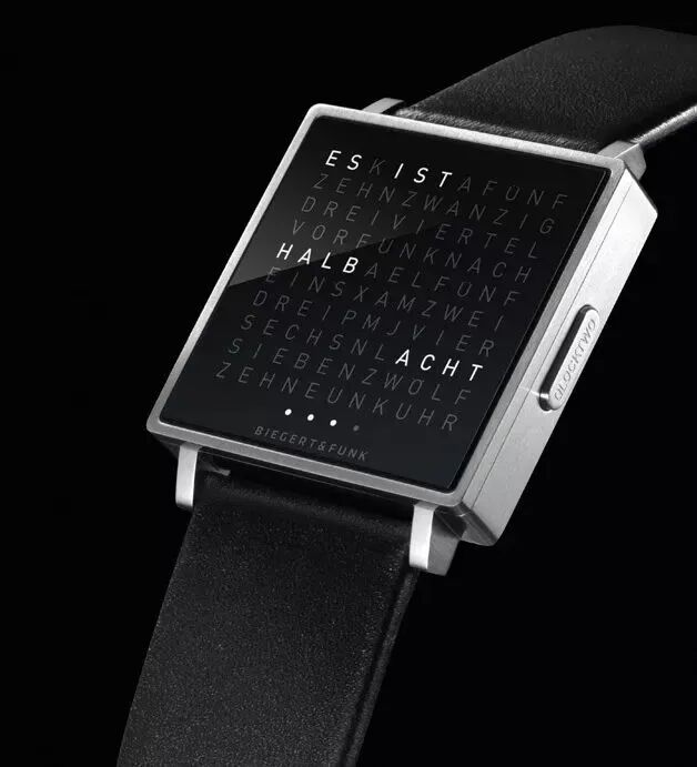 德国钟表品牌BIEGERT & FUNK为了要挑战及突破传统腕表的概念,推出QLOCKTWO W文字手表,以别具创意的时间显示方式挑战大家对手表的传统印象——以文字句子来演绎时间。利用不同透光的生字,到了相应的时间便会显示出相对的句子,以清晰发光的句子表达时间。