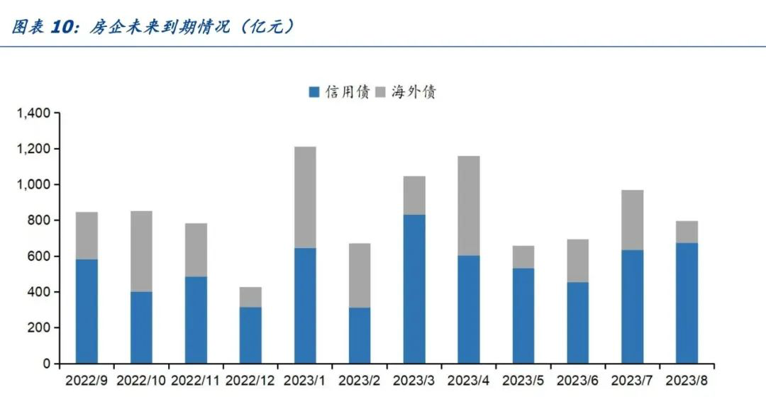 相关数据显示,以49家典型房企信用债融资情况为例,目前仍以国企和龙头民企融资为主,近半数民企甚至长期难获资金;2023年1月、3月、4月偿债压力较大,海外债+信用债到期规模分别为1211.2亿元、1045.8亿元和1157.7亿元。