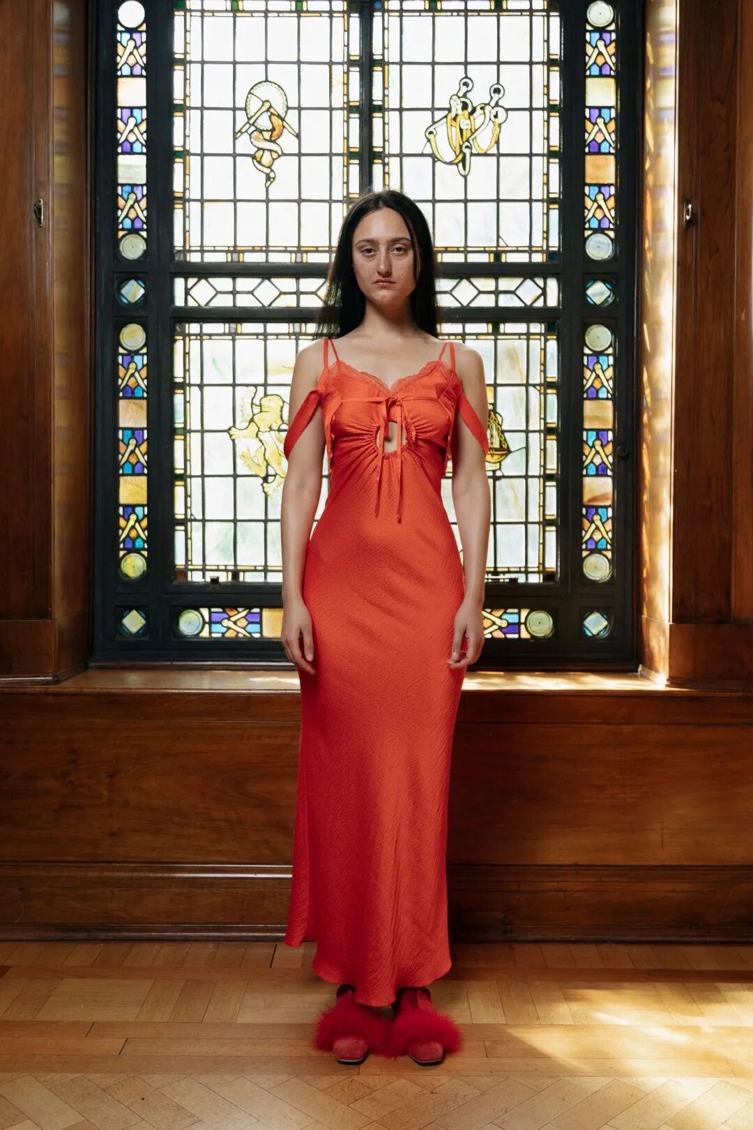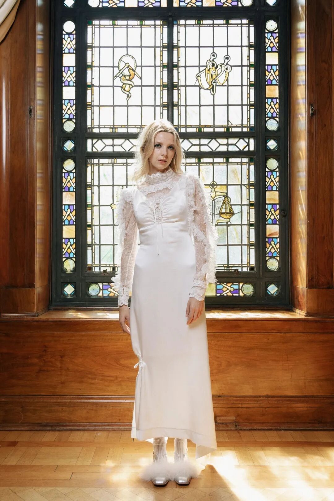 2023早春秀场中,Preen从睡衣中寻找灵感,用缎子、丝绸、带有浪漫色彩的蕾丝、褶皱和垂坠来创造扭曲、不对称的轮廓。