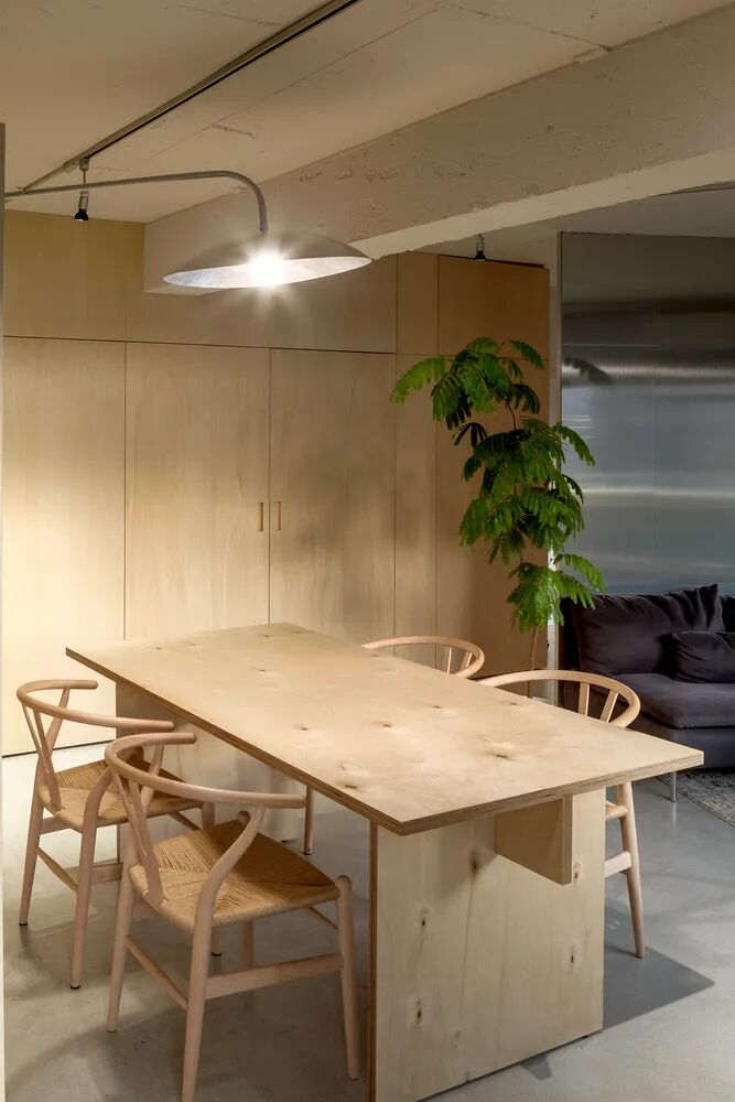 餐厅的桌椅也十分质朴,原木色、线条简单分明,背后是一组餐边柜,同时也是餐厅与厨房的隔断。