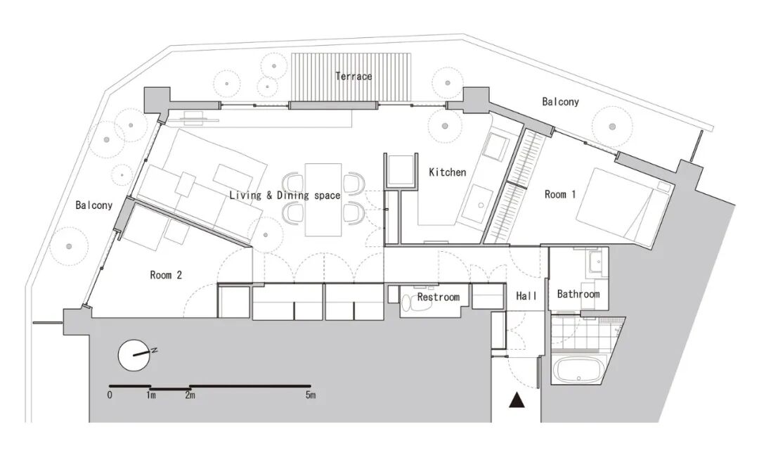 客餐厅也是一个不规则的空间,深灰色的布艺沙发靠着落地窗摆放,阳光柔柔的射入,沙发旁一棵鸭脚木自在舒展。