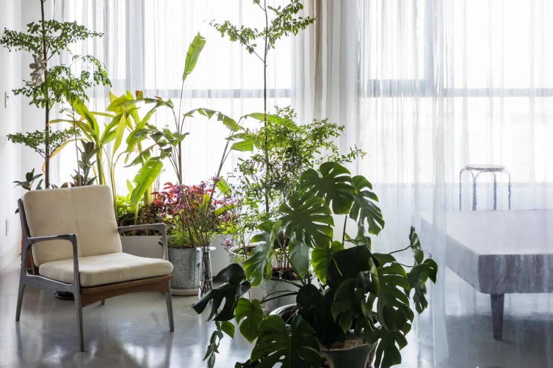 书桌正前方就是客厅区,客厅没有设置任何娱乐设施,而是布置了一个植物角,家中的大部分绿植都放在此处,像一个小小植物园~