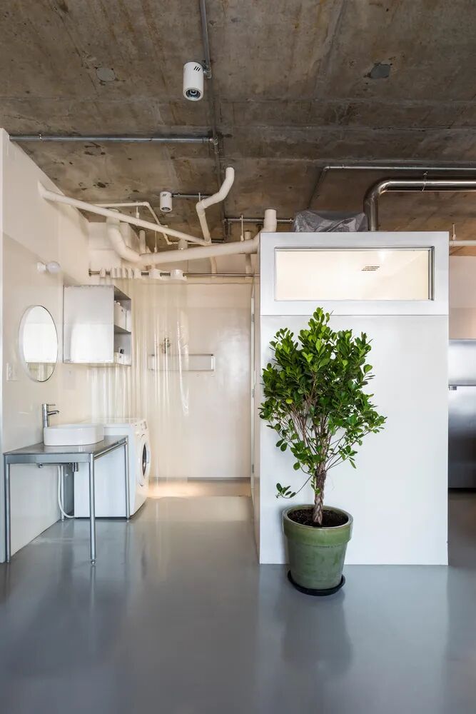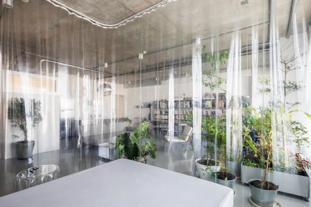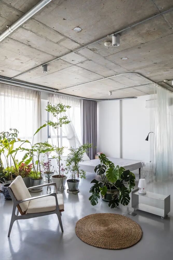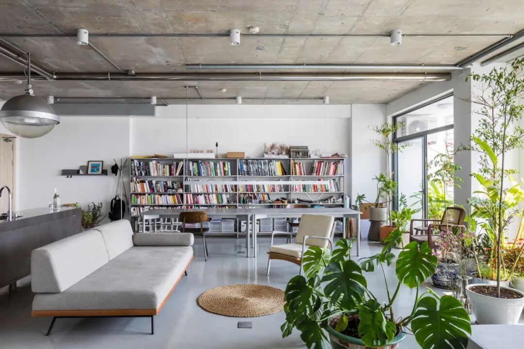 水泥的天花板、朴素的白墙、浅灰色环氧地坪,室内简单摆放着几件家具,沙发、扶手椅、长桌、书架,几盆绿植生机勃勃~