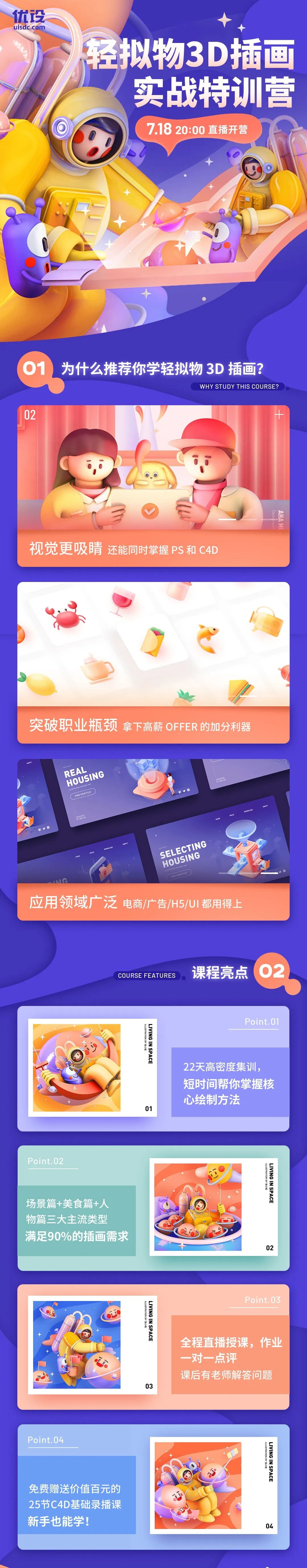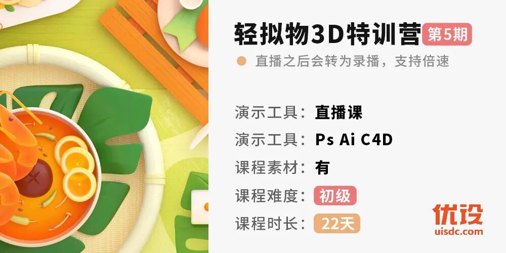 课程中总计有6组实战项目带练+练习+作业讲解,每2组项目为一对,主题相同,但是分别会以轻拟物化插画 和 3D 插画来进行呈现,在这过程中,你不仅能够循序渐进掌握相应的技能,而且能在转换之间,两相对照,更加深入理解 2D 轻拟物插画和 3D 插画之间的关联和差异。