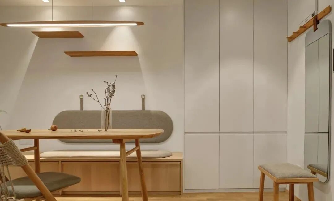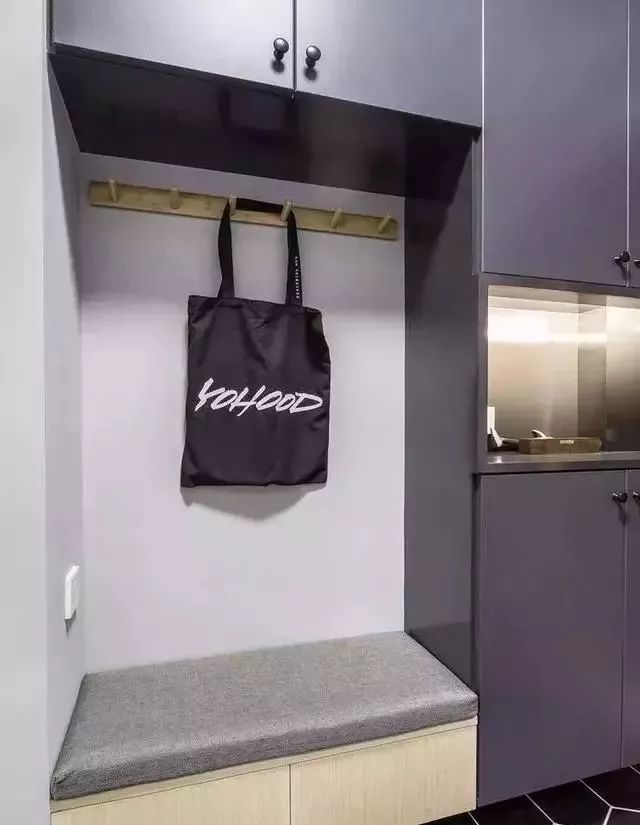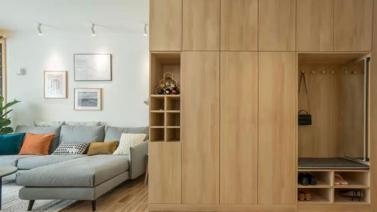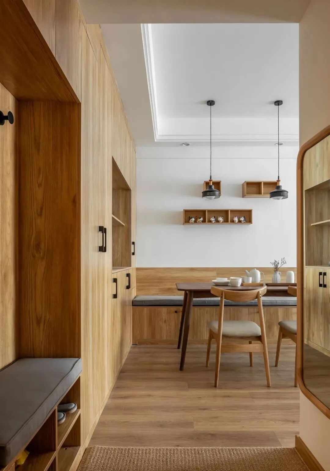 鞋柜加入卡座元素不仅便于在进出门时轻松完成换鞋过程,尤其是对于有老人或者孩子的家庭,安全便捷,同时也增加了门厅空间的储物功能。而鞋柜和卡座的款式装饰与材料质感,要与整体协调统一,保持视觉上的整洁。