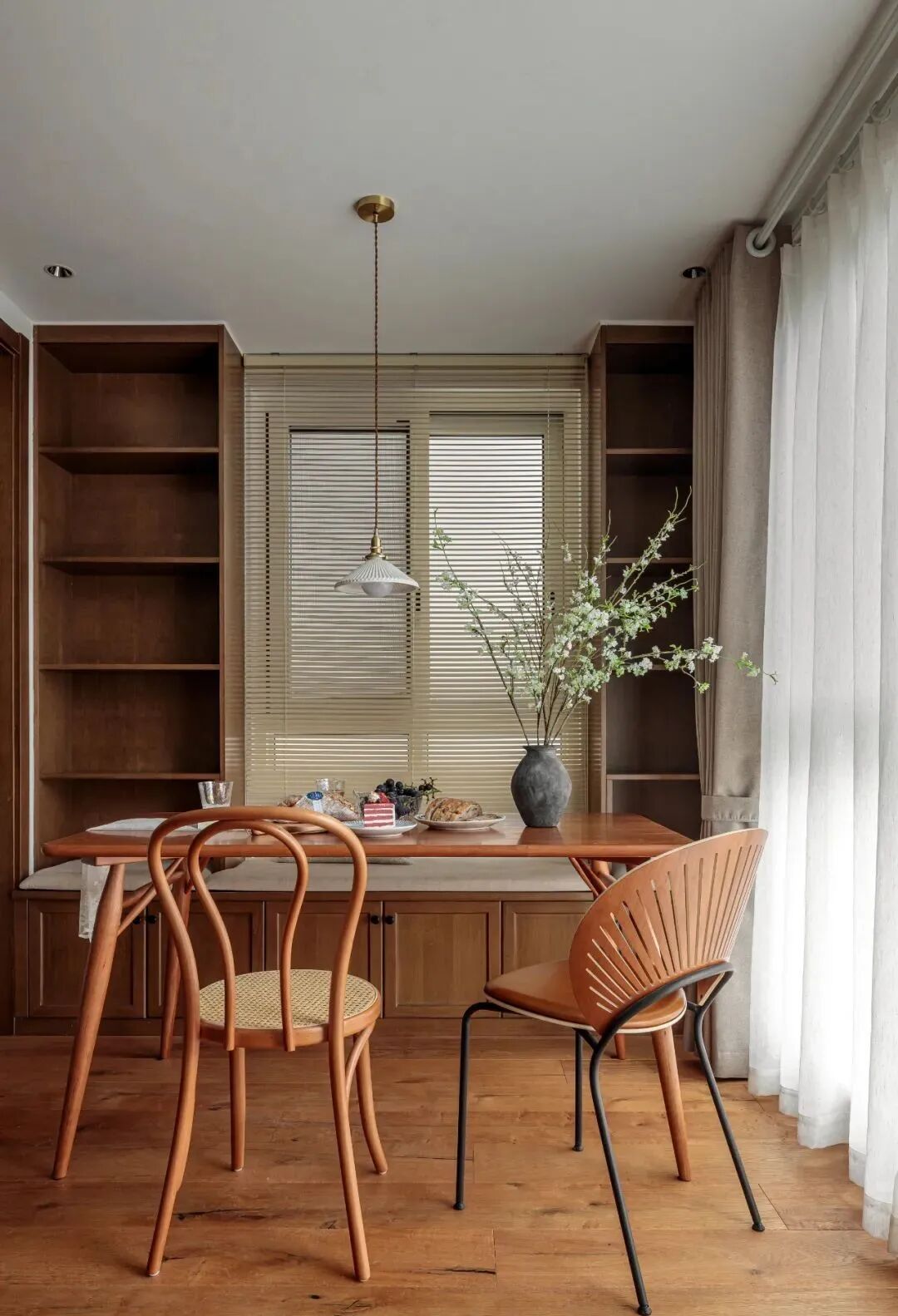 客厅的飘窗,打造成卡座设计,这样处理相当于做多一张超长的沙发。家里来客人了,再也不会没有地方坐了,也是平时休闲放松好地方。