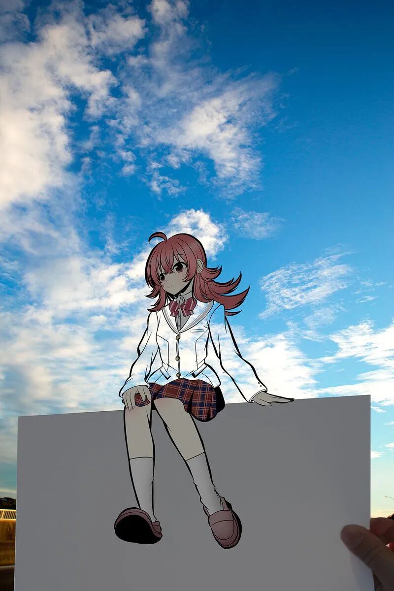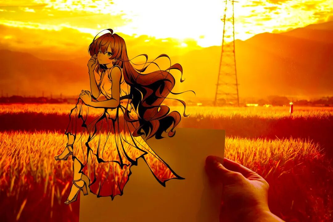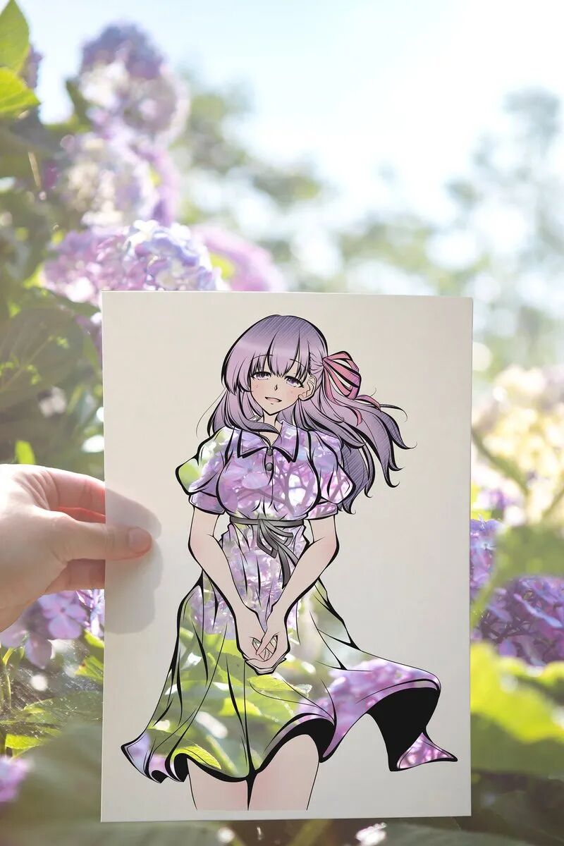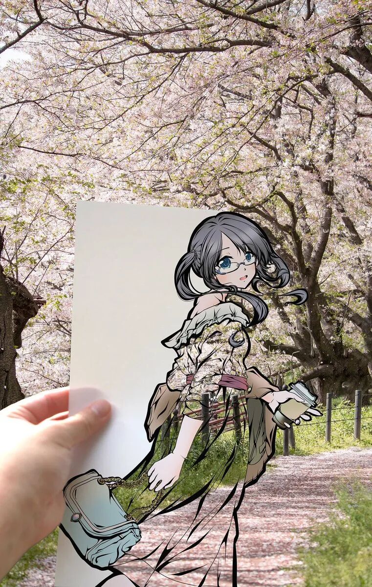 虽说虎彻是一位插画家,其实,他的作品更偏向于摄影和剪纸,这是因为,他的插画作品往往绘制在白纸上,然后用剪刀和刻刀裁剪掉插画角色身上的衣服,最后,再将绘有插画角色的纸与不同风景合照,风景中的色彩会透过剪裁的镂空,呈现在我们眼前,就像是给这些插画角色穿上了衣服一样。