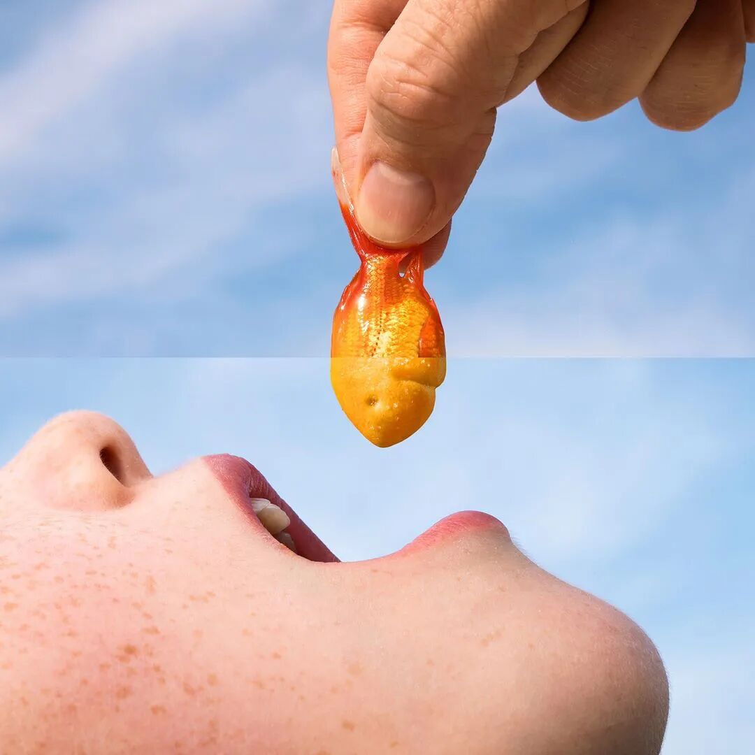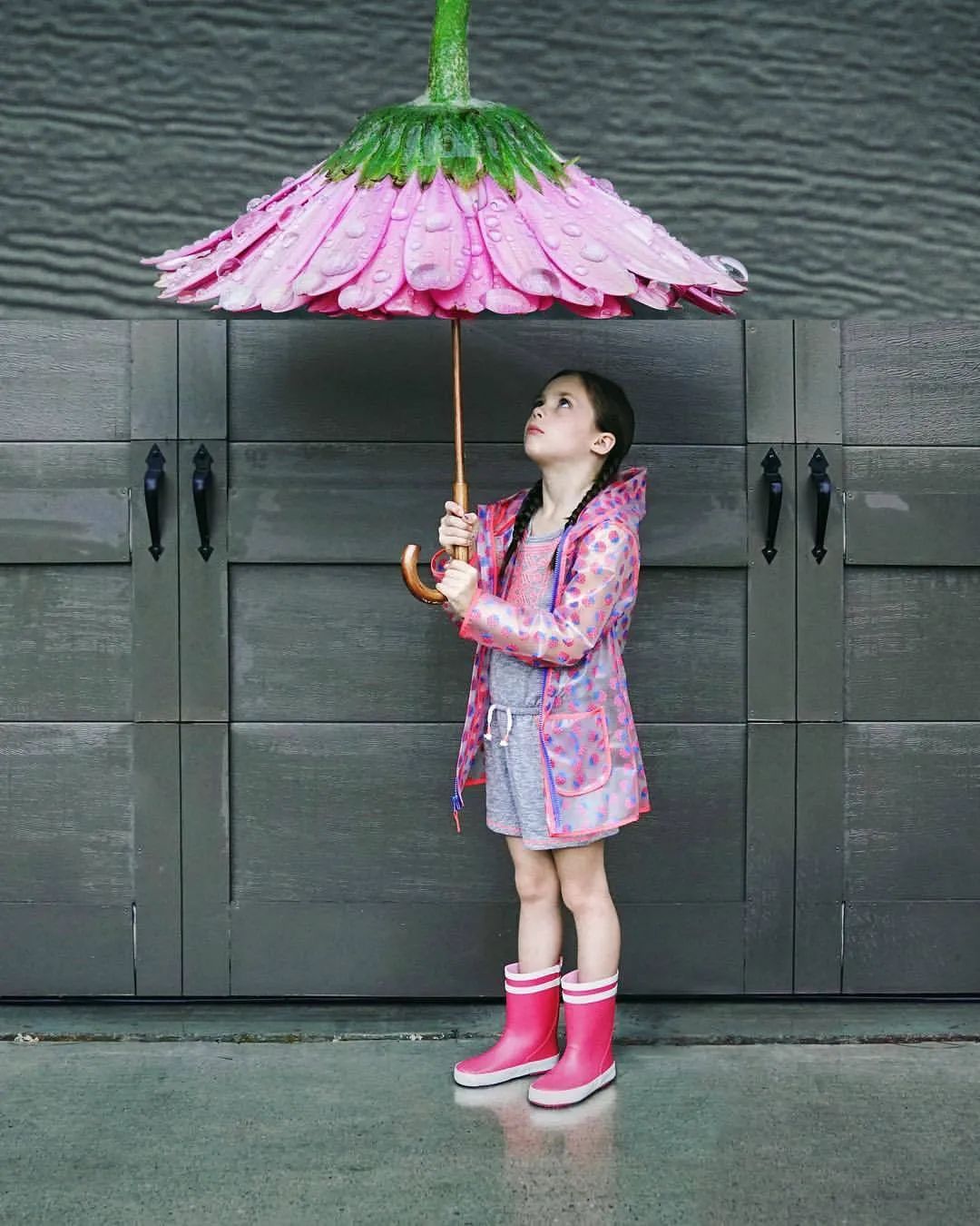 比如剥了皮的香蕉变成了黄色小轿车的车顶,带着露珠的花瓣成了女孩手里的一把伞,从花园水管喷出糖豆而不是水等等,艺术家以独特的方式将颜色、图案和想法搭配在一起,形成的如贴画般的趣味构图,让人忍不住发出笑声。