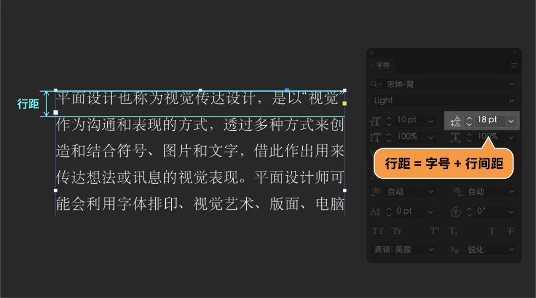 内文行距就是在大段文字中,行与行之间的距离。而在AI软件的“字符面板”中,行距的数值是通过“字号大小+行间距”所得。