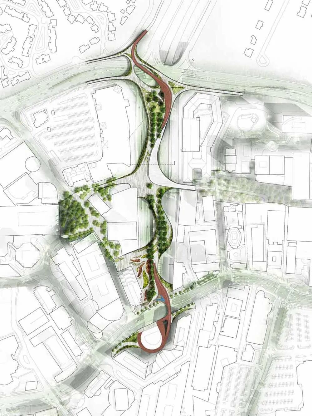 20世纪中叶的城市规划学者设想了一种全新的城市生活方式,他们的理念无条件地接受汽车作为未来的交通方式,他们的现代城市设计方法确保汽车不会遇到任何障碍。 半个多世纪后,我们每天都感受到以汽车为中心的设计带来的不可预见的后果:交通拥堵、空气污染以及社区之间缺乏凝聚力。现状已经足够棘手,但随着城市的发展和气候变化对我们城市基础设施的威胁越来越大,这些问题只会变得更糟。 通往更具弹性和更绿色城市的途径之一是回归更简单的城市化理念:让城市对行人更加友好,可惜说起来容易做起来难。现代城市的建造几乎不考虑步行性和可达性,很多时候,城市的设计使汽车与公共交通、步行和骑自行车等其他交通方式在空间上发生冲突,每一次都是汽车得到优先考虑权。 这不应阻止城市开展优先考虑行人的城市基础设施项目,不管先前存在的城市规划对行人有多不友好,现在建筑公司都在寻找创造性的和政治上可接受的解决方案来提升步行可达空间的存在感。 PART 1 务实设计 以工业革命最大受益城市之一迈阿密市为例,这座城市的街区中间穿插着宽阔而不吸引人的林荫大道,这使得摆脱对汽车的依赖尤其具有挑战性。当一座城市主要按照以汽车为中心的方法发展时,如何打造一个更适合步行和以公交为导向的城市环境呢? 这个问题注定非常复杂,因为任何新的基础设施项目都需要是一种无障碍且有吸引力的设计,既能吸引行人又不会为日常通勤带来不便,否则大批的通勤人员可能会反对任何占用当前道路空间的举措。 对迈阿密来说,James Corner Field Operations似乎找到了理想的解决方案。他们的城市重建项目“高线之下”利用城市高架地铁线下方的空地,将其改造成一个郁郁葱葱、行人友好的线性公园,直通迈阿密市中心。 “高线之下”在走廊上增加了蜿蜒的自行车道和宽阔的人行道,并在其中点缀了大量的本土植物。除了设计丰富的通道外,地下通道还成为了自己的文化中心,建筑师将这里组织成一系列“房间”——社交空间,如舞台区、户外健身结构和篮球场,鼓励行人在各个区域消磨时间,可以在这里放松、运动或者与朋友见面。 得益于务实且以社区为中心的设计,James Corner Field Operations将以前的死胡同变成了一个社交场所。此外,“高线之下”还让迈阿密居民更容易使用公共交通工具,公园现在将城市公交车与公共线路连接起来,在迈阿密市中心打造了一个坚固的交通中心带,提供步行、便捷的公共交通,并提高了交通网络的凝聚力和整体体验感。 PART 2 大局观 以人为本的城市空间的另一个典型做法正在另一座城市形成,美国亚特兰大北部的巴克海特区正朝着更大胆的方向采用以行人为导向的设计。社区拥有成为一个充满活力的混合用途社区所需的一切:优质零售、购物和餐饮与中高层住宅楼交织在一起。但是,非常缺少的是一个大型开放式聚会空间,而在像巴克海特这样的人口稠密的市中心,这是不可能获得的空间。 罗杰斯及合伙人事务所提议从头开始建造一个新空间,在仔细研究了市中心起伏的地形后,设计了一系列旋转排列的高架人行道和位于城市高速公路上方的公园。 设计包括三个规划区域:公共区域、广场和花园,每个都可以容纳一系列的活动和项目,包括广场、花园和凉亭,同时种植松树为行人提供荫蔽。 公园不仅将成为汽车定义的城市中心的一片适合步行的绿洲,而且还可以帮助社区团结起来。项目将社区的不同部分缝合在一起,将区域的高速公路网络分开,精心设计但无障碍的人行道无缝地融入了当前的街道网格。如果想去城镇的另一边吃点东西,完全可以在设计优雅的公园空间中穿过高速公路。 在我们努力建设更健康、更绿色的城市地区时,我们的城市必须将步行便利性放在首位,适合步行、可达的社区鼓励体育和社交活动,从而使城市更宜居。即使是在建造时没有考虑到行人的城市也不应被这项任务吓倒,建筑师将继续寻找建筑解决方案,适应未来城市发展衍生出的无论多大胆或多务实的需求。