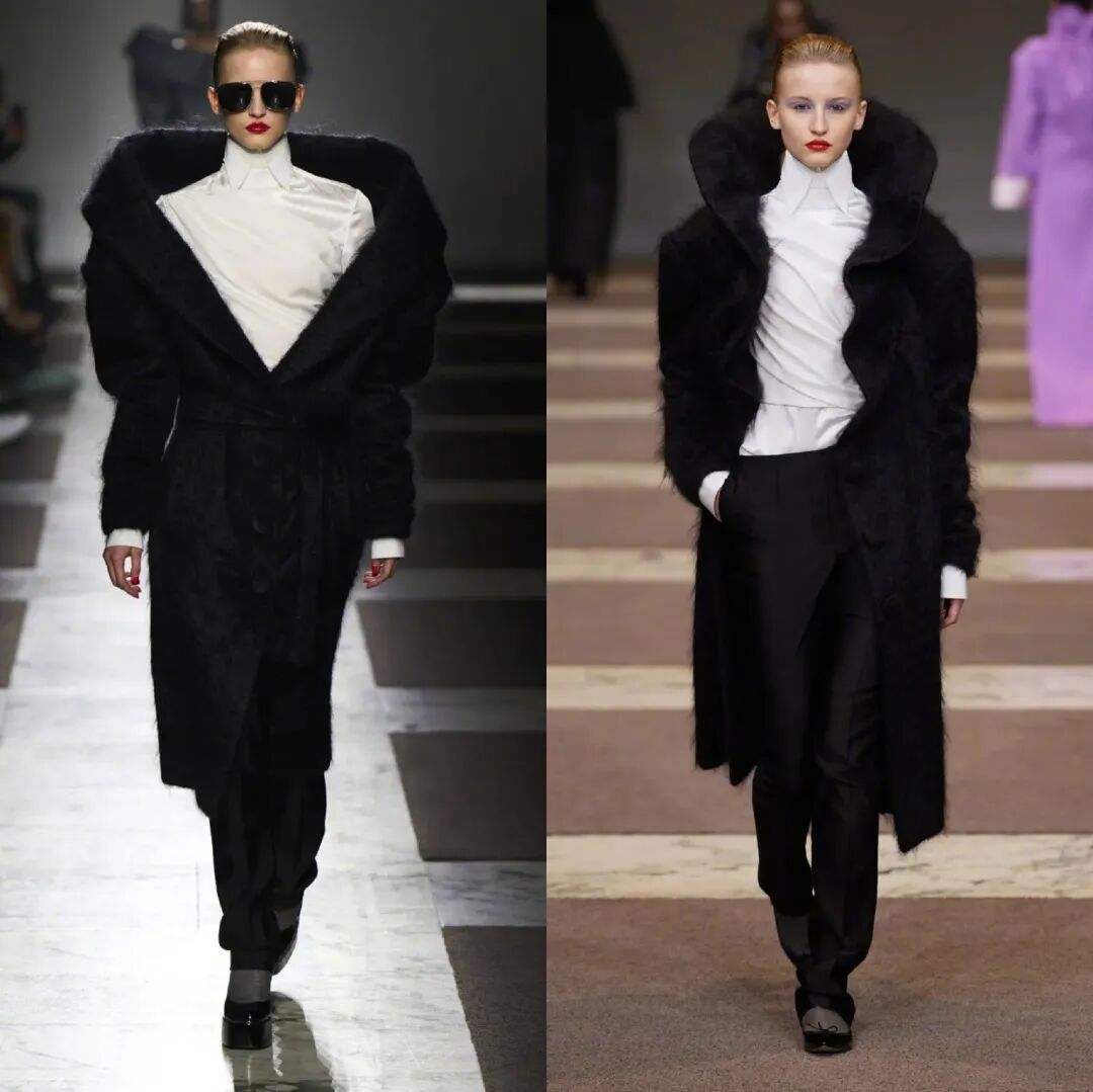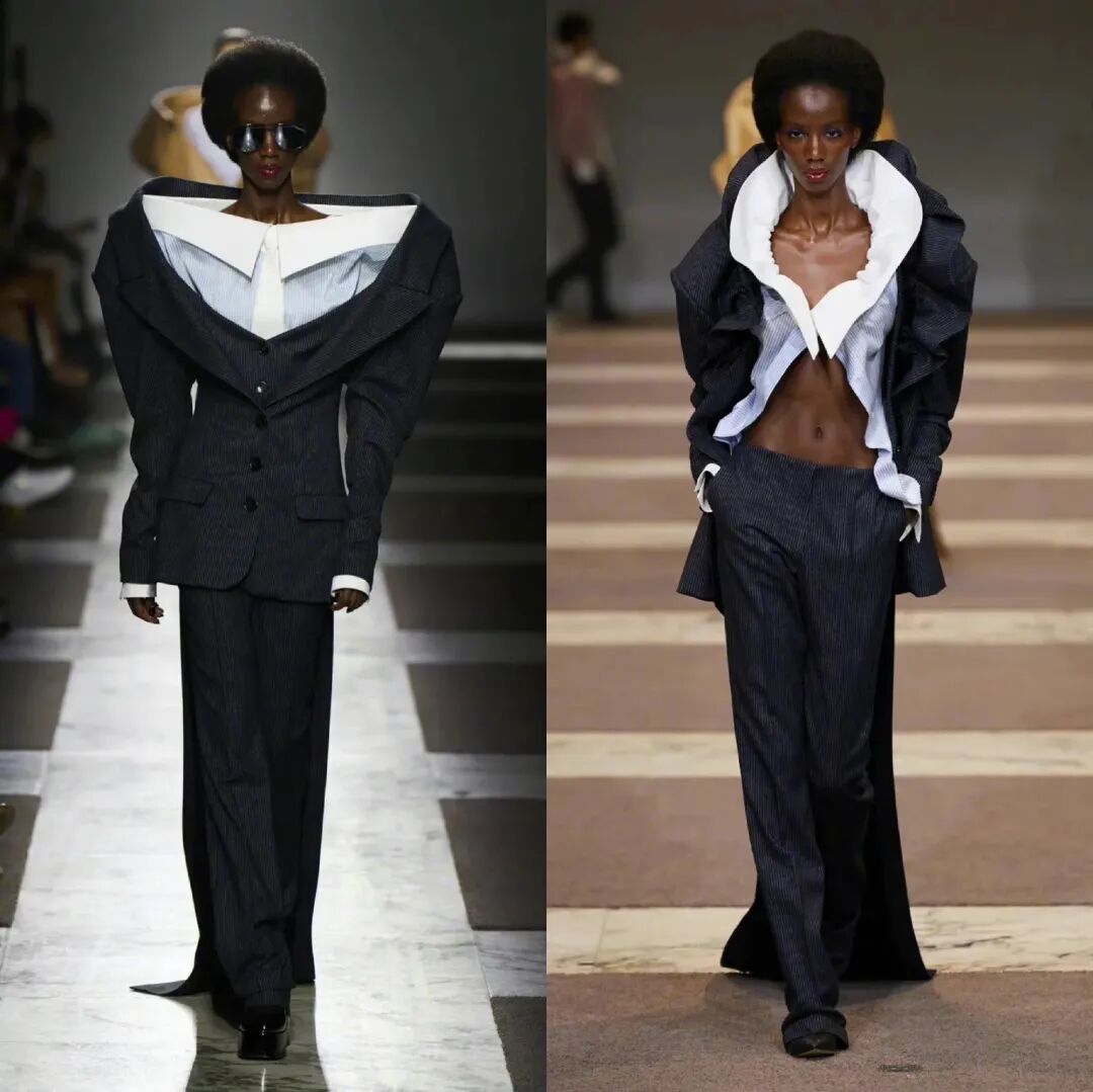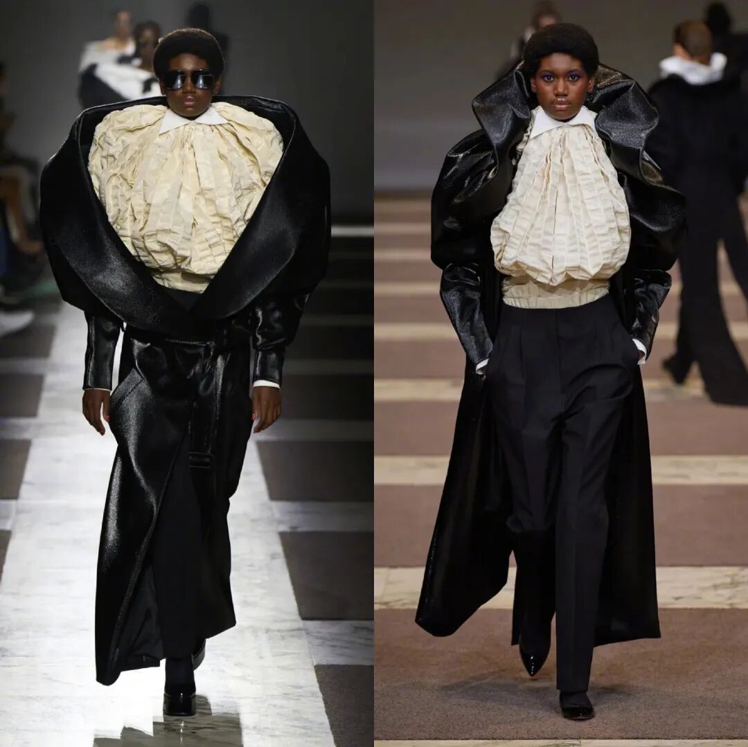 秀场的前半部分采用了同样的结构化高领设计,看起来就像是悬浮在穿着者的肩膀上方。后半部分展示的是它们的折叠,给模特们披上了一层褶皱。“这是一种完全不同的态度,首先是非常严格,非常严格,然后态度就会转向更柔和、更放松的东西。”