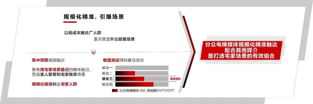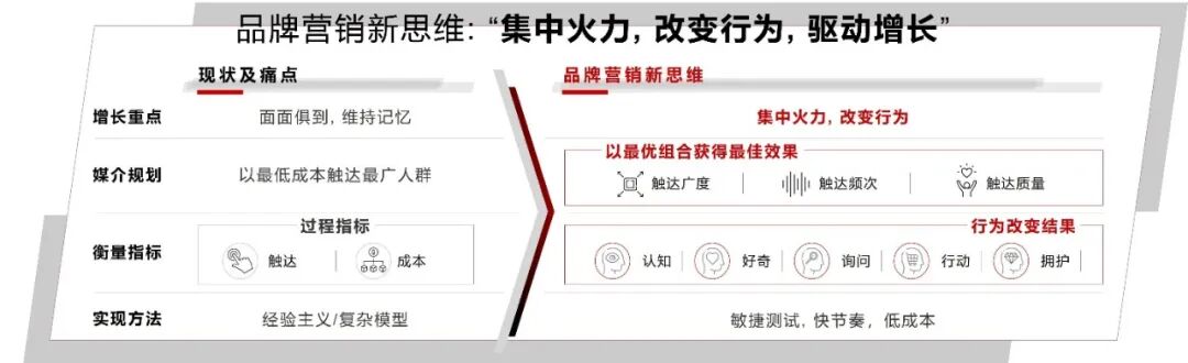 2、营销从流量到恒量:集中火力、最优组合、敏捷测试、结果导向,重构媒介最优组合。