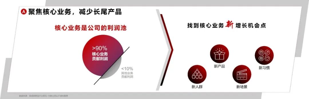 根据对消费品行业领先的30多家公司的分析,贝恩发现通常核心业务贡献了公司超过90%的利润。聚焦核心业务并不意味着一成不变,反而更应找到当今形势下的消费者真需求。消费者不是消费不起,而是找不到消费的理由了。所以必须根据不同品类消费者的真需求,开创新产品,挖掘新场景,拓展新人群,培养新习惯,开拓核心业务的新增长机会。