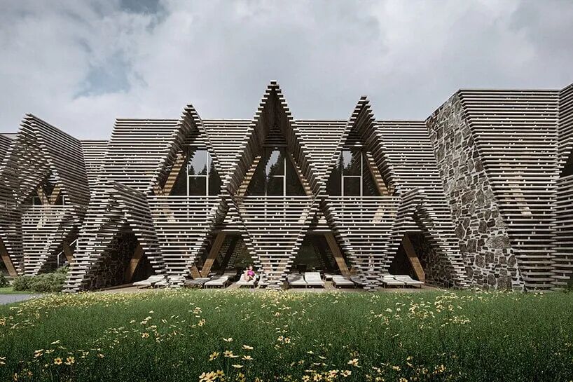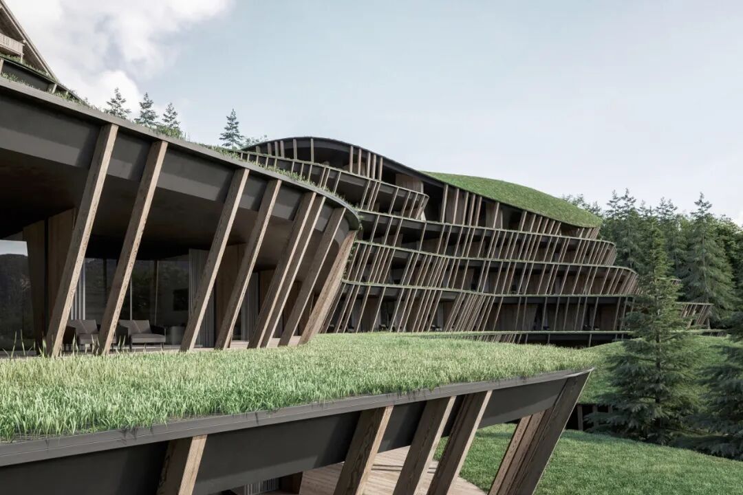 然而,酒店住宿提供者在现实世界中的需求是截然不同的,他们希望提供尽可能多的带阳台的住宿空间;这样一来,其外观、规模与那些单独的小木屋就几乎没有共通之处。不过,这也启发了建筑师的设计决策,决定将立面与屋顶融为一体,连接无法连接的事物。
