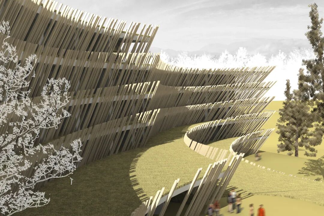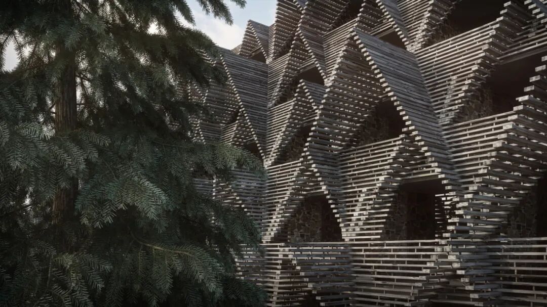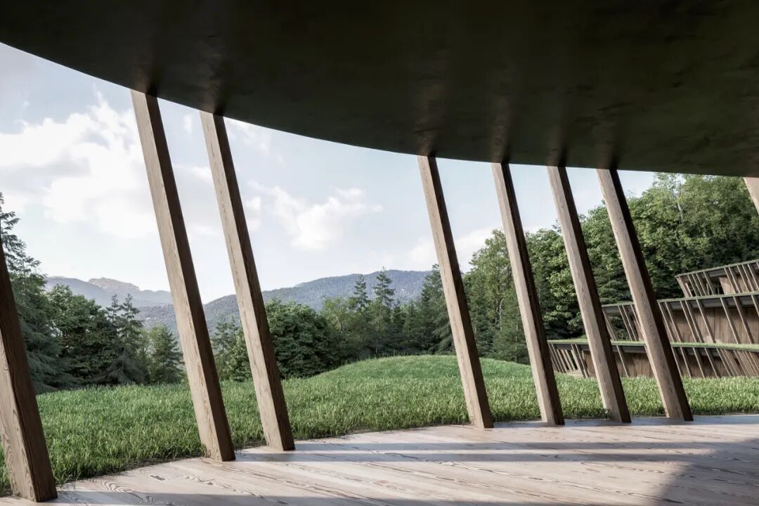 最终外立面在视觉上的呈现是具有本地特色的木山墙屋顶,自由堆叠且未做保护处理的立面木材能随着年岁的老化,在外观上与周围景观融为一体。