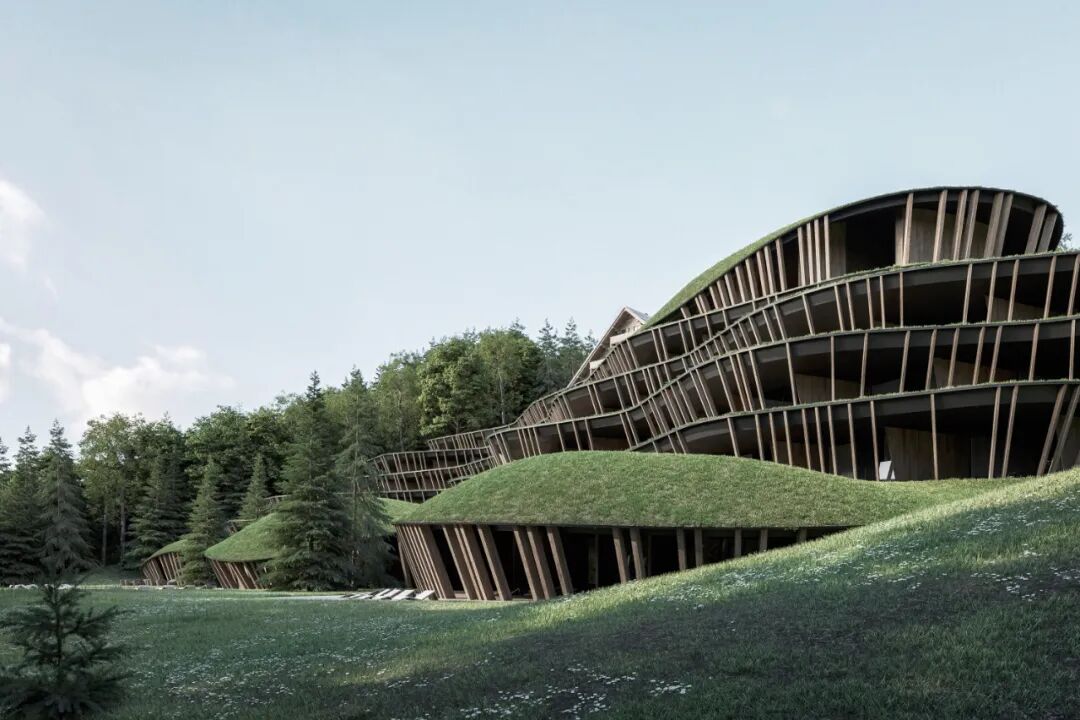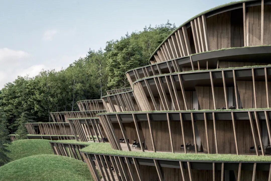 布莱德是一个拥有悠久旅游传统的小镇,酒店坐落在森林中,酒店设计的主要准则是提供完美的自然体验。垂直的木材元素突出了建筑的曲线,天然的材料不会从环境中脱颖而出,它们会随着时间优雅地老化,最终建筑物与所在的环境融为一体。