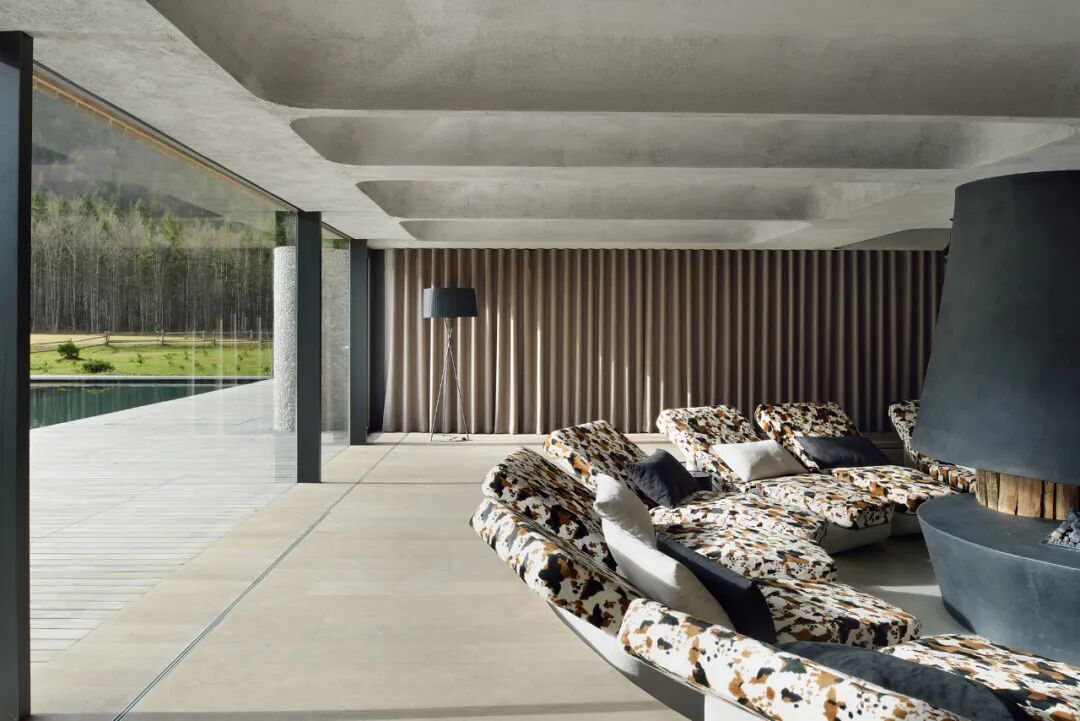 室内布局上,设计师把居住空间和公共区域进行了明显划分,较高的建筑体面向北部的森林腹地,作为公共空间来使用,引入壮阔的自然景观。