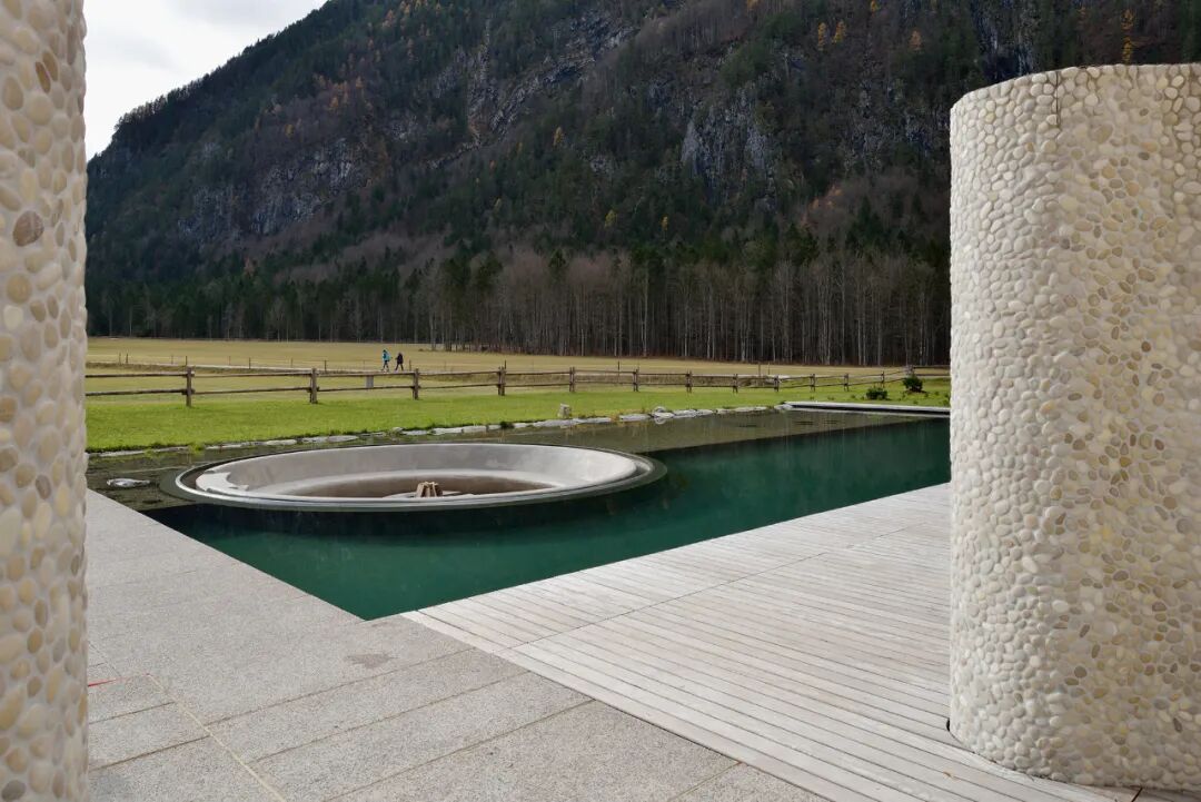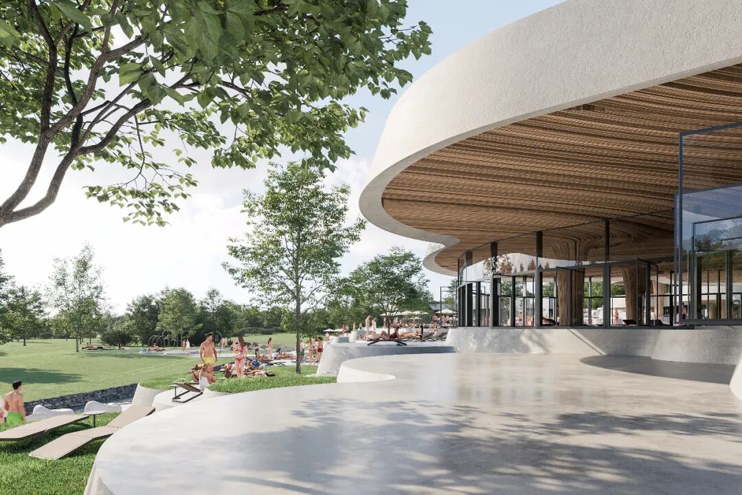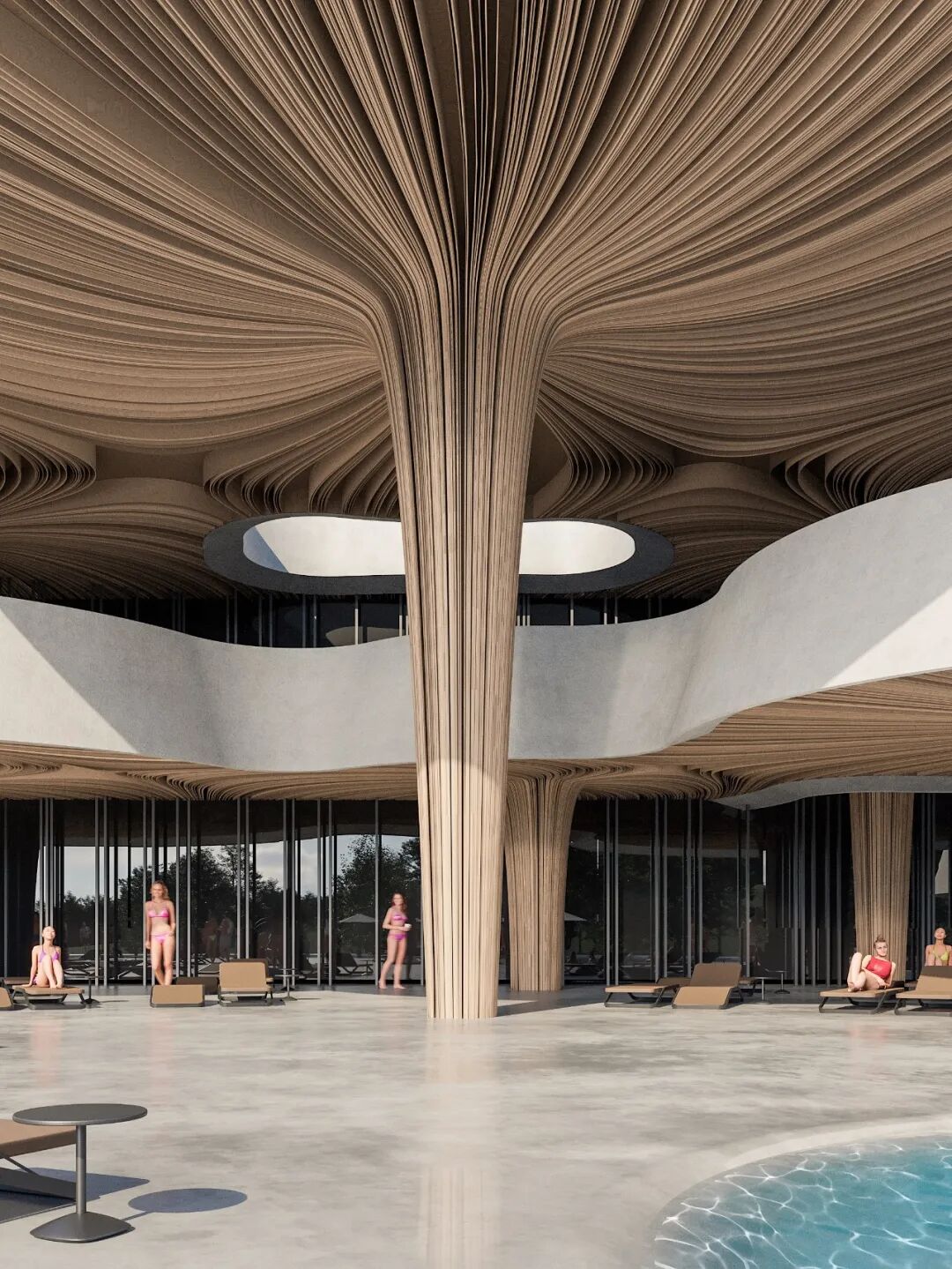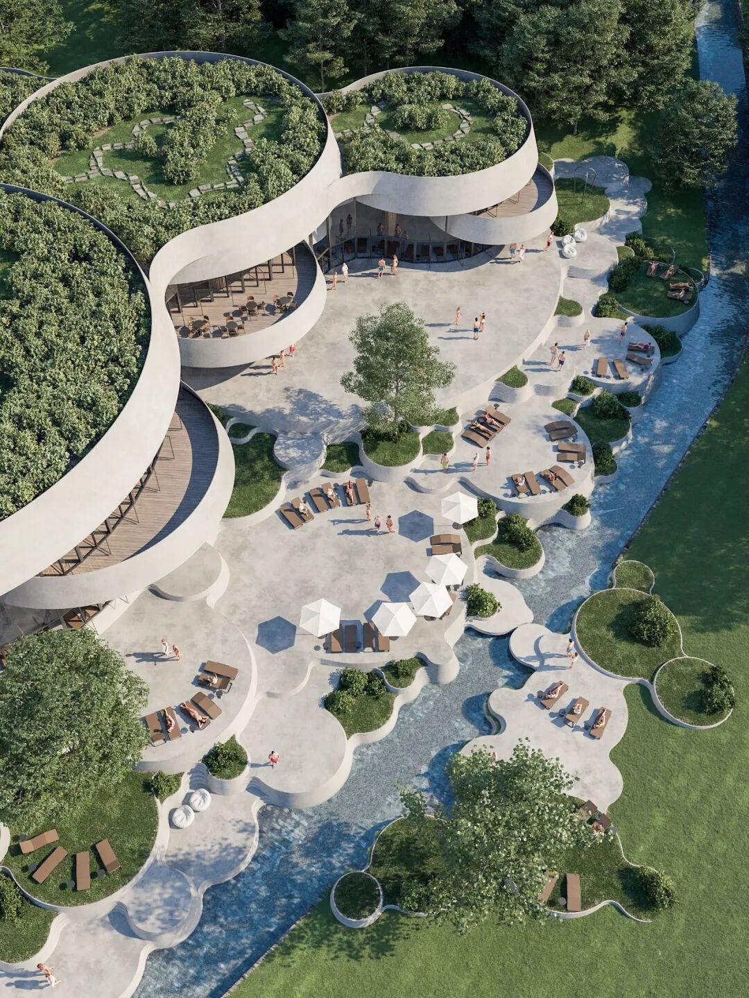 Banja Vrućica 是一个拥有悠久历史的医疗旅游项目, 最近进行了大规模翻新,这是项目外部的一个游泳池平台,空间的视觉设计呈现有机形态,以圆形笔画为基础,所有的建筑都使用相同的材料和设计原则,最终实现综合统一的视觉表达。