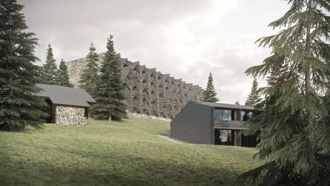 建筑师提出的适应性方案是设计一个具有独立外观且与现有建筑具备逻辑性连接关系的新建筑体量,那么项目的外观体现应是什么样的呢?当来访者前往 Rogla 山顶时,他们脑海中对风景的印象是相当浪漫的:原始且未受破坏的大自然中的一座白雪皑皑的小木屋。