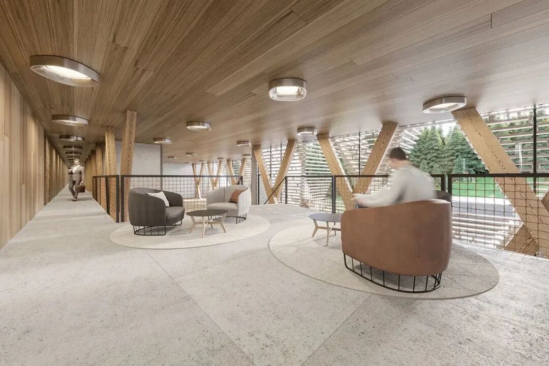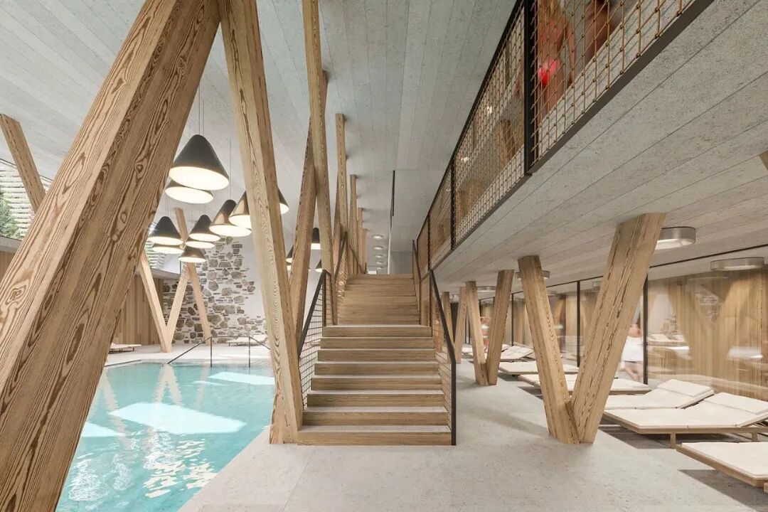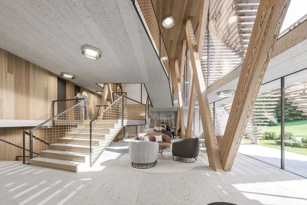 而较低的建筑体面向南部的滑雪场,作为客房来使用,两侧楼层间的高度偏差则由设置在“垂直大厅”中的全新楼梯和双向电梯弥合串联。