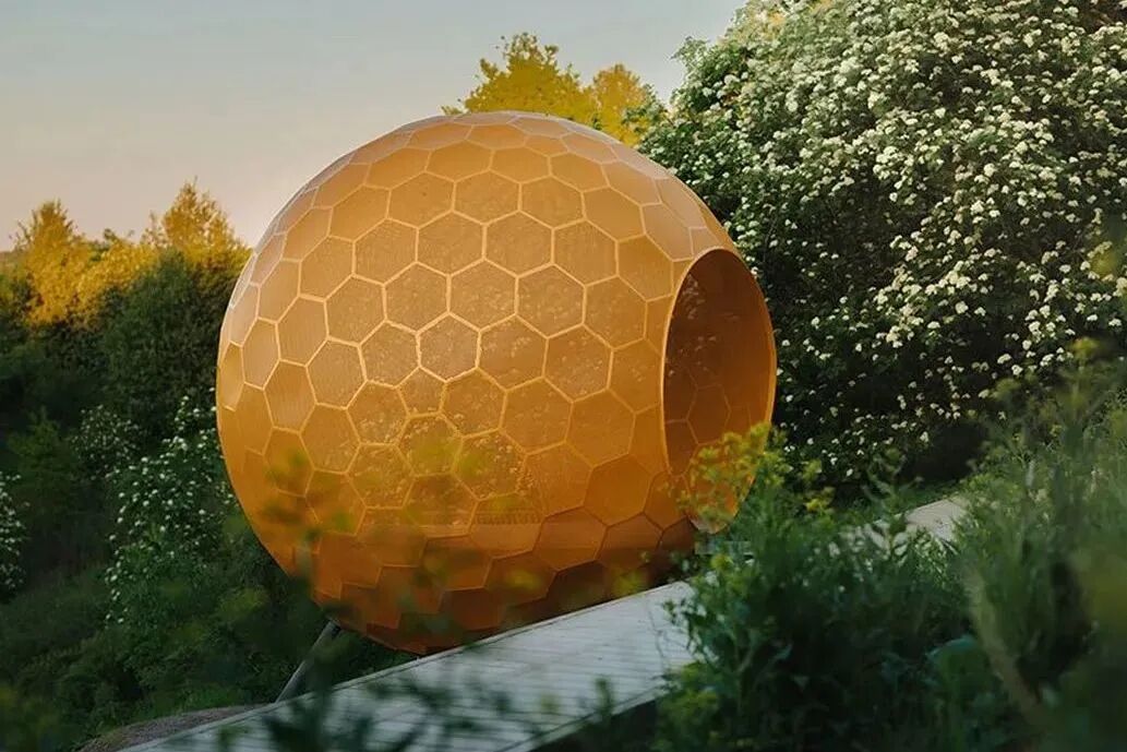 白天,橙色球体的穿孔金属过滤来自外部的光线;夜间,被照亮的球体内部则会发出柔和的光芒,成为静谧公园中的温暖小屋。