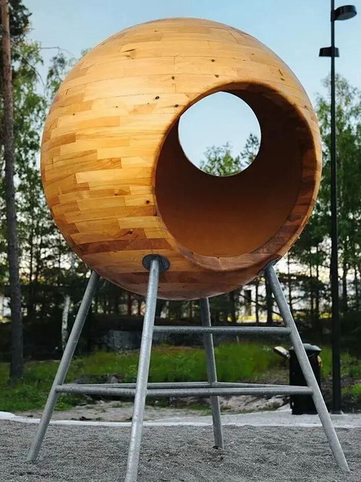 橙色大球坐落在陡峭山坡上,仿佛随时会滚落下来,给予人丰富的感官刺激。在平坦沙地的实木球则带有滑梯和小座椅,让年幼的孩子尽情玩耍。