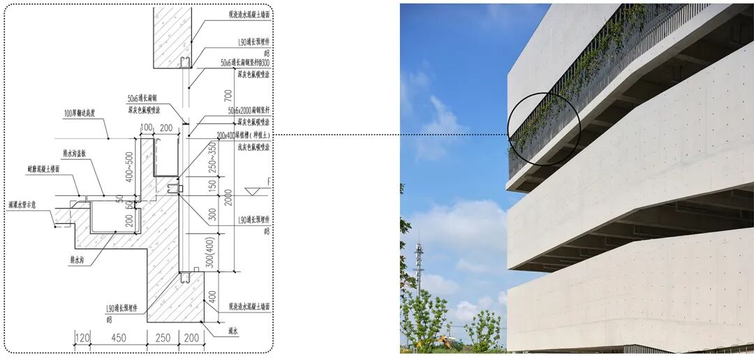 为与东侧的牙皮所建筑相呼应,我们加高了原有清水混凝土翻起的围护结构,通过上翻与下挂相结合形成更具实感的横向立面线条,与旁侧建筑形成空间上的延续,也进一步强化了这种空间、流线与形式的统一性。