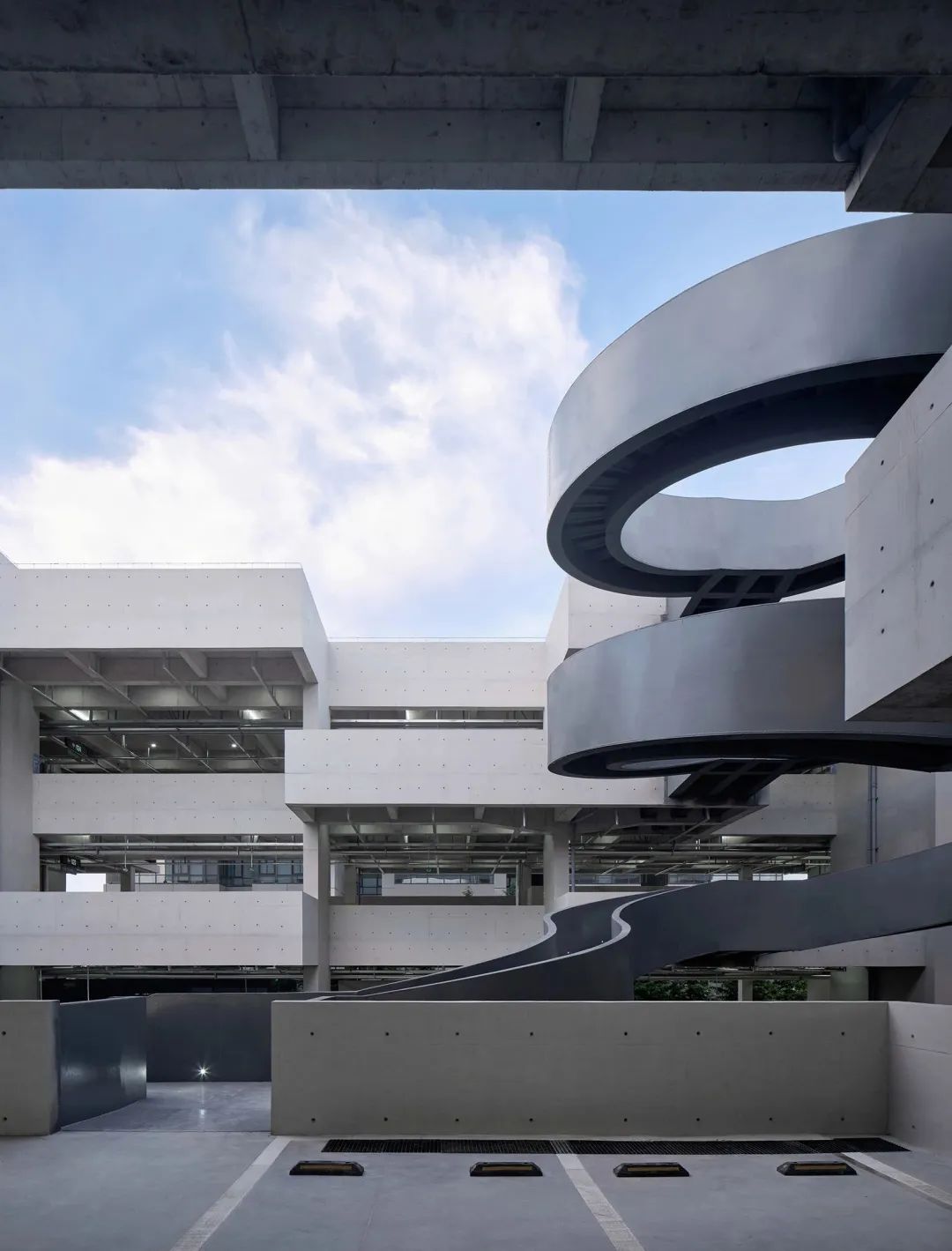 错层楼板除了缩小面层间的高差外也有效减小了汽车坡道的长度,在两组错层楼板间我们植入了一组盘旋而上的坡道空间作为停车流线里的重要竖向交通,链接起两组重要的停车功能空间。