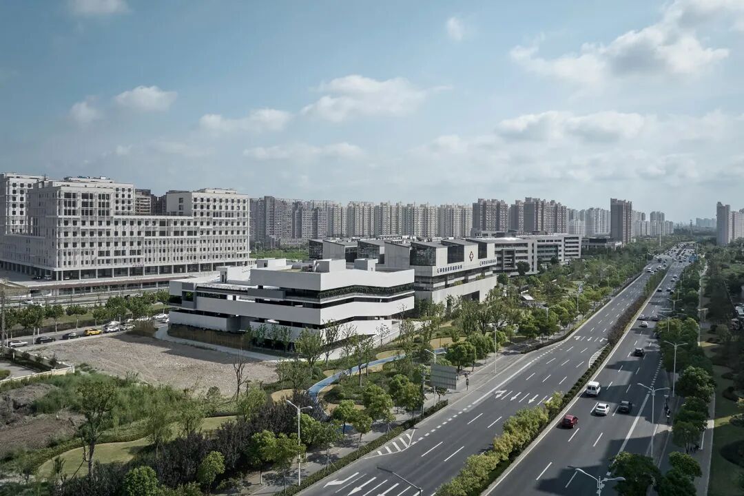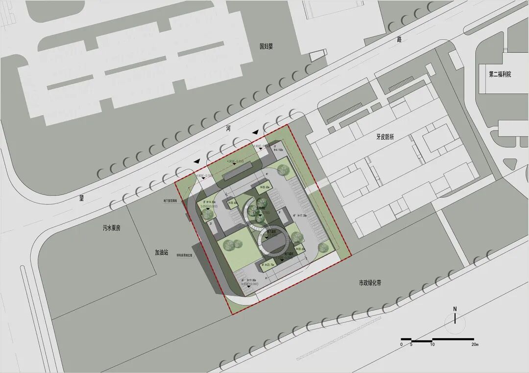 项目伊始我们刚刚完成相邻的东侧地块奉贤区牙防皮防所的建筑设计,在西侧地块尚未开发,东侧沿东方美谷大道的城市建筑条带延续的基础条件下,如何塑造两组建筑间的关系成为了我们首要考虑的问题。