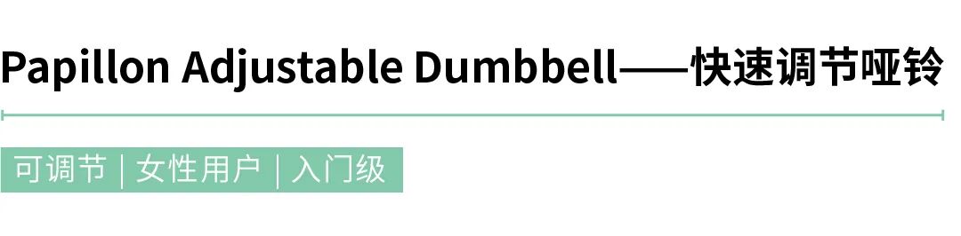 Papillon是法语蝴蝶的意思,由女生双手举哑铃动作延伸;这款产品是为女性用户量身打造的有氧哑铃,可快速调节2-5磅4种重量,配合哑铃操,满足用户从入门到初级训练的需求。随着用户健身经验的增加,身体素质也在提高,这是设计可调哑铃的初衷。且产品包裹天然橡胶,触感柔软,保护地板同时无需佩戴手套也可舒适训练。